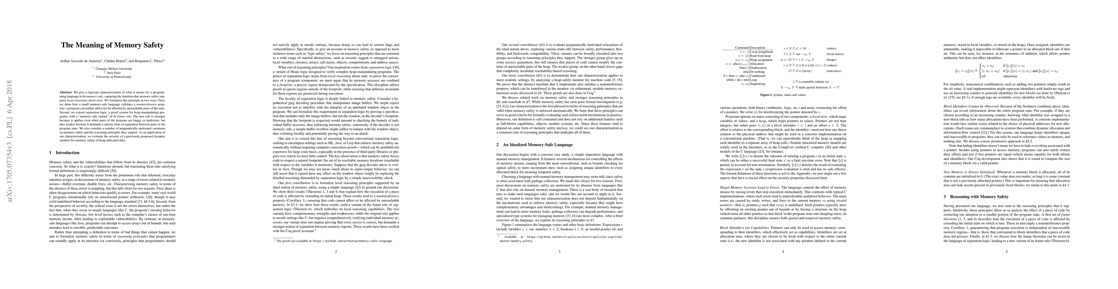 We give a rigorous characterization of what it means for a programming language to be memory safe, capturing the intuition that memory safety supports local reasoning about state. We formalize this principle in two ways. First, we show how a small memory-safe language validates a noninterference property: a program can neither affect nor be affected by unreachable parts of the state. Second, we extend separation logic, a proof system for heap-manipulating programs, with a memory-safe variant of its frame rule. The new rule is stronger because it applies even when parts of the program are buggy or malicious, but also weaker because it demands a stricter form of separation between parts of the program state. We also consider a number of pragmatically motivated variations on memory safety and the reasoning principles they support. As an application of our characterization, we evaluate the security of a previously proposed dynamic monitor for memory safety of heap-allocated data.
