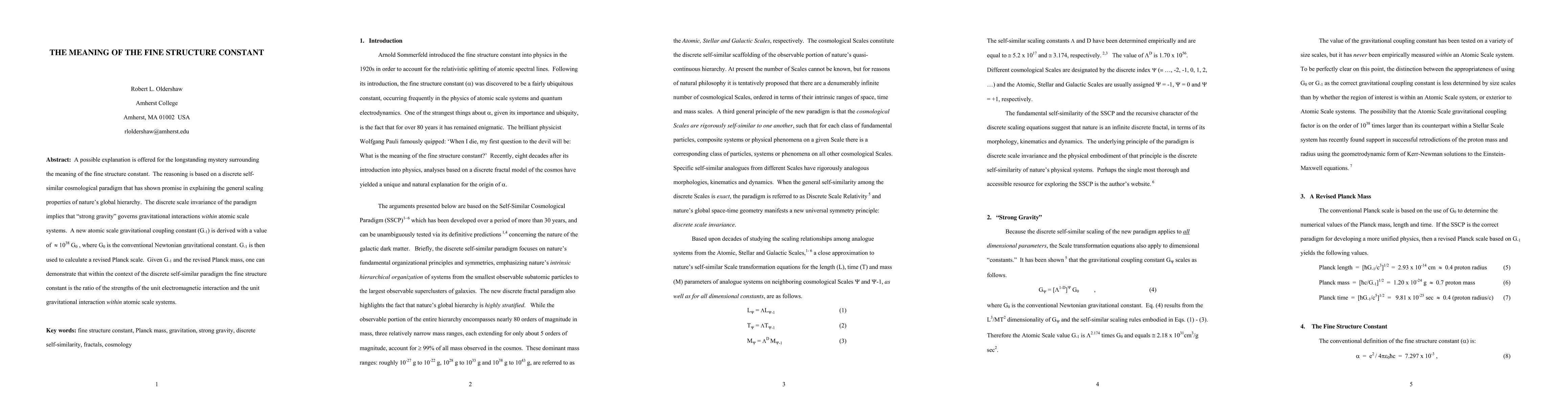 A possible explanation is offered for the longstanding mystery surrounding the meaning of the fine structure constant. The reasoning is based on a discrete self-similar cosmological paradigm that has shown promise in explaining the general scaling properties of nature's global hierarchy. The discrete scale invariance of the paradigm implies that "strong gravity" governs gravitational interactions within atomic scale systems. Given the revised gravitational coupling constant and Planck mass, one can demonstrate that the fine structure constant is the ratio of the strengths of the unit electromagnetic interaction and the unit gravitational interaction within atomic scale systems. [Abridged]
