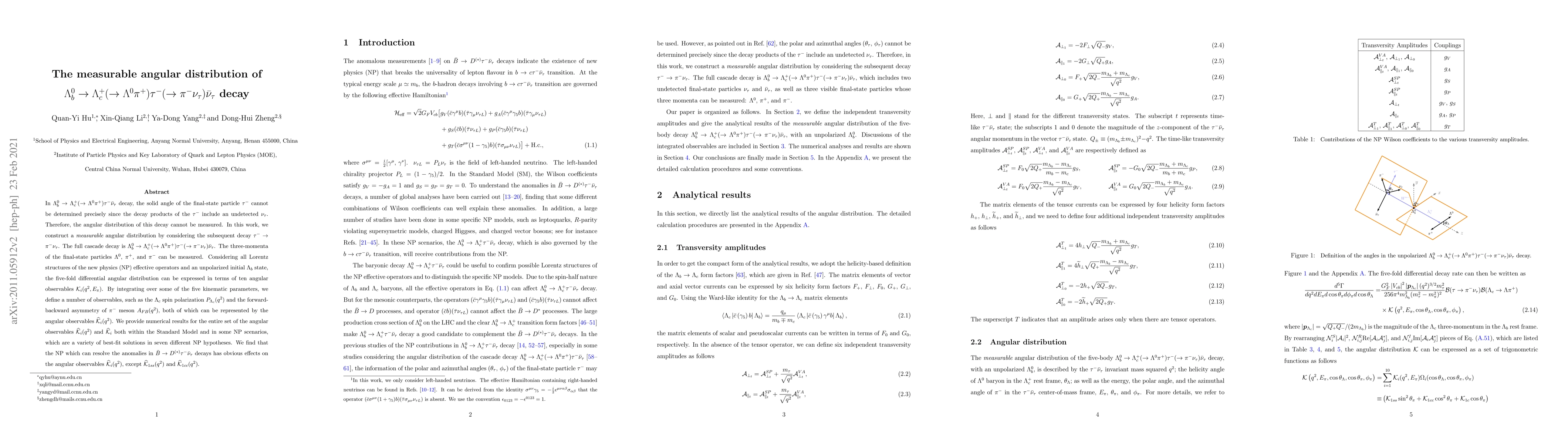 This paper constructs a measurable angular distribution for the decay $\Lambda_b^0 \to \Lambda_c^+ (\to \Lambda^0 \pi^+)\tau^- (\to \pi^- \nu_\tau)\bar{\nu}_\tau$, defining ten angular observables ${\cal K}_i$ that can be measured. It explores the effects of new physics scenarios on these observables, finding significant deviations from Standard Model predictions in most cases except for $\widehat{{\cal K}}_{1ss} (q^2)$ and $\widehat{{\cal K}}_{1cc} (q^2)$.