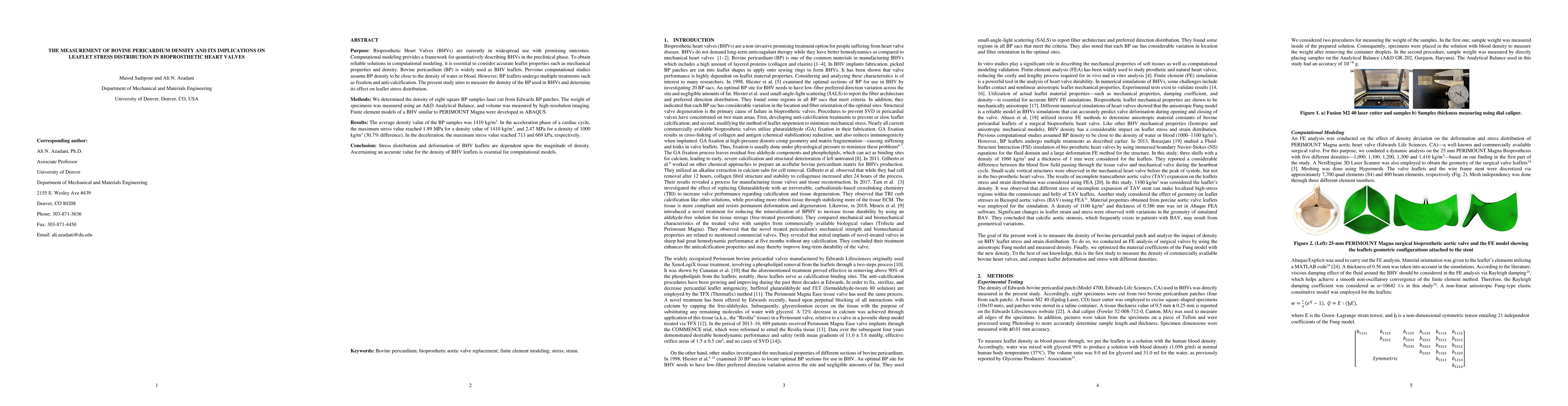This study measures the density of bovine pericardium used in bioprosthetic heart valves (BHVs) and assesses its impact on leaflet stress distribution. The average density was found to be 1410 kg/m³, significantly affecting stress values during cardiac cycle phases, highlighting the importance of accurate density data in computational modeling.