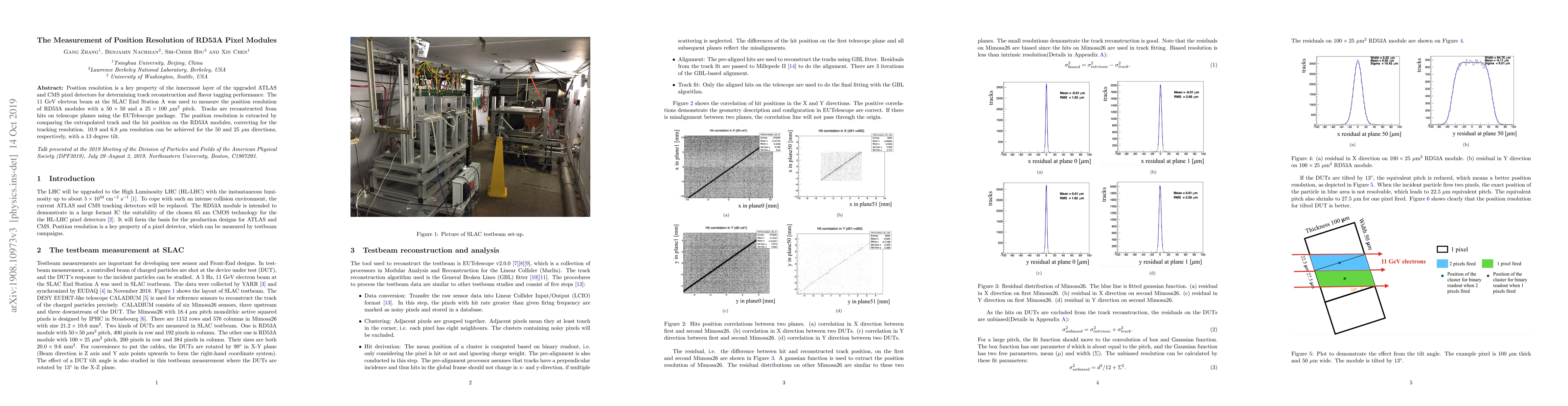 The research measured the position resolution of RD53A pixel modules using a 11 GeV electron beam at SLAC End Station A. Tracks were reconstructed from hits on telescope planes using the EUTelescope package, and the position resolution was extracted by comparing the extrapolated track and the hit position on the RD53A modules, correcting for the tracking resolution.