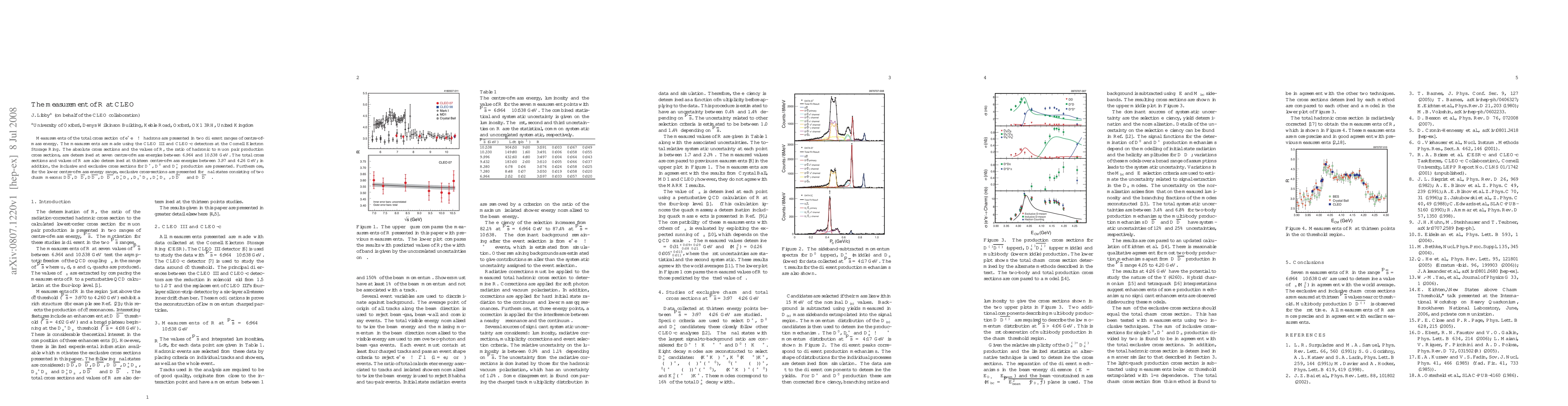 This paper presents measurements of the total cross section for e+e- -> hadrons using CLEO III and CLEO-c detectors at various centre-of-mass energies, determining the R ratio at seven energies between 6.964 and 10.538 GeV, and also detailing inclusive and exclusive cross sections for D meson production at lower energies.