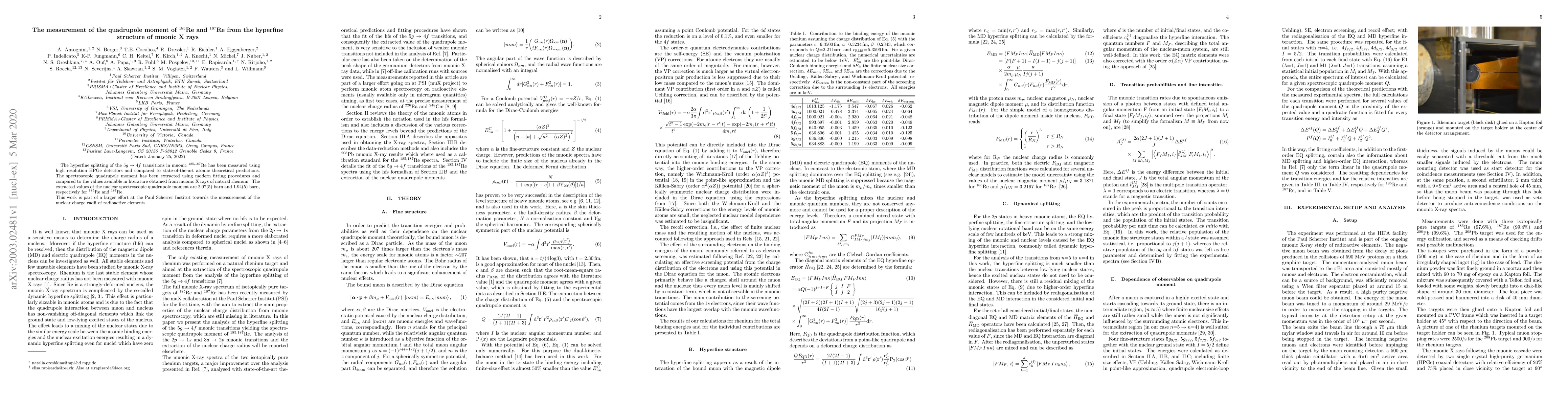 This study measures the hyperfine splitting in muonic 185,187-Re to determine their nuclear spectroscopic quadrupole moments, finding values of 2.07(5) barn and 1.94(5) barn respectively, and compares these to theoretical predictions and previous literature values. This research contributes to efforts at the Paul Scherrer Institut to measure nuclear charge radii of radioactive elements.
