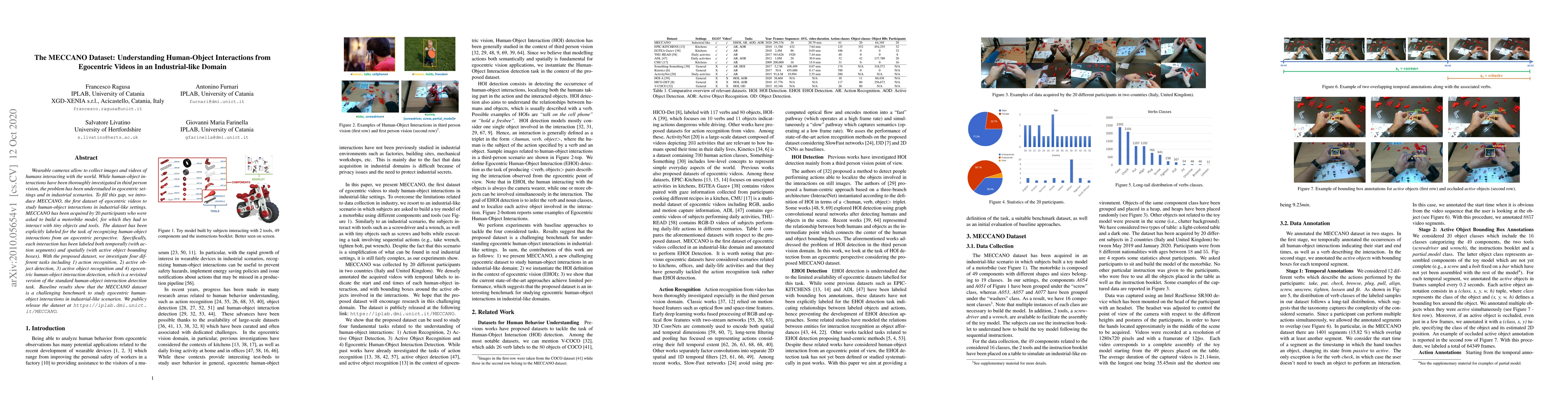 The MECCANO dataset presents egocentric videos of 20 participants assembling a motorbike model, focusing on human-object interactions in industrial settings. The dataset is labeled for tasks like action recognition, active object detection, and egocentric interaction detection, offering a challenging benchmark for studying such interactions from a first-person perspective.