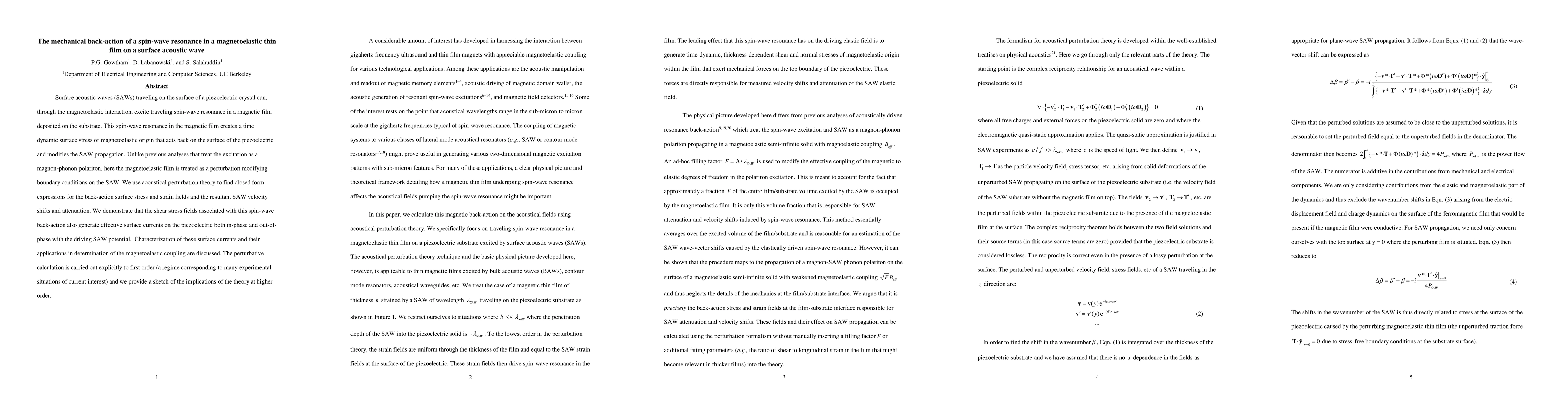 This paper investigates the mechanical back-action of spin-wave resonance in a magnetoelastic thin film on surface acoustic waves (SAWs) in a piezoelectric crystal, using acoustical perturbation theory to derive expressions for the resulting stress and strain fields. It demonstrates the generation of effective surface currents due to shear stress fields, with implications for magnetoelastic coupling characterization.