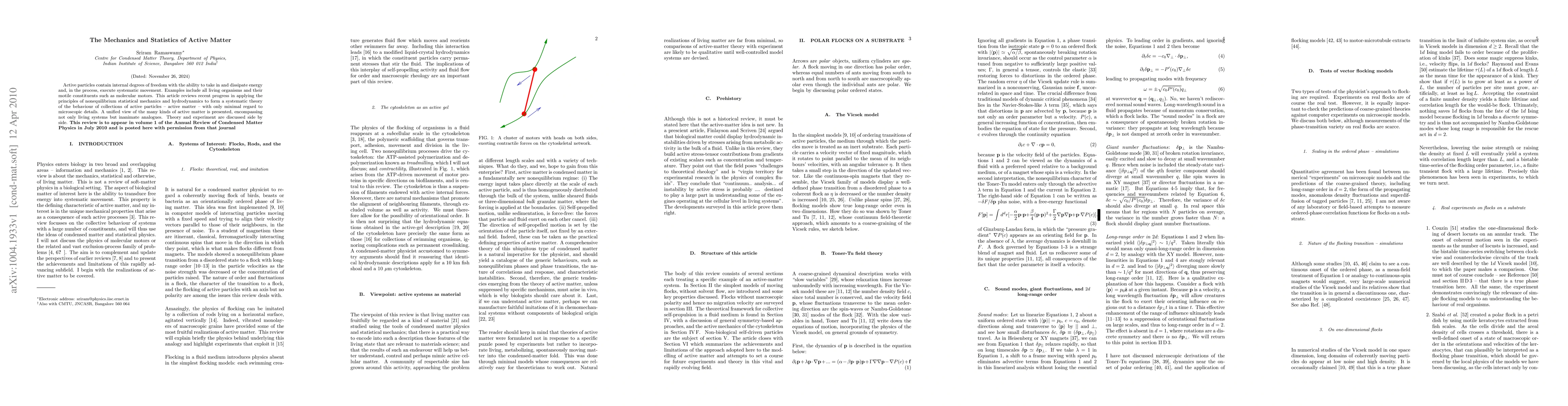 This paper reviews advancements in understanding active matter, focusing on nonequilibrium statistical mechanics and hydrodynamics to develop a comprehensive theory of collective behavior in active particles, including both living organisms and inanimate systems, with a comparison of theoretical models and experimental findings.