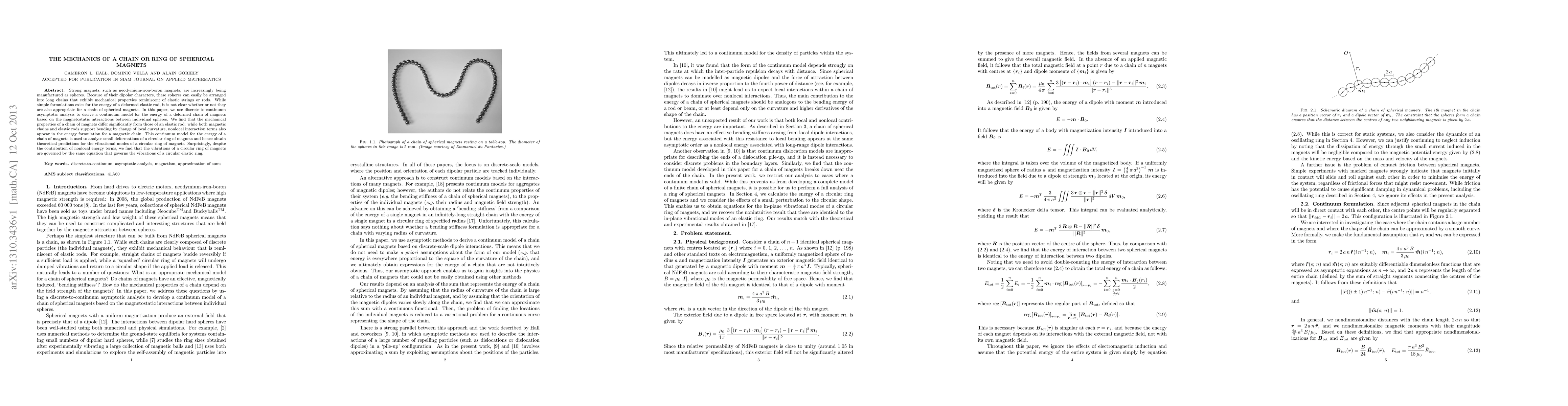 This paper develops a continuum model for the energy of a deformed chain of spherical magnets based on magnetostatic interactions, revealing significant differences in mechanical properties compared to elastic rods due to nonlocal interaction terms. It also predicts that the vibrational modes of a circular ring of magnets are governed by the same equation as those of a circular elastic ring.