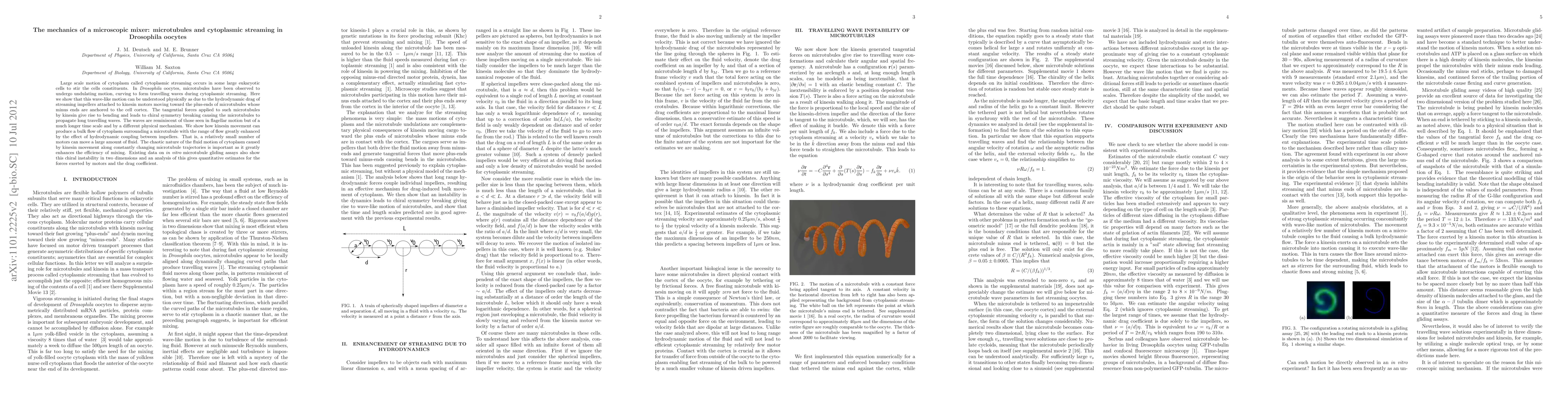 This paper explores the mechanics of cytoplasmic streaming in Drosophila oocytes, demonstrating that microtubules undergo wave-like motion due to the hydrodynamic drag of kinesin motors. The study reveals how kinesin-induced tangential forces cause microtubule bending and chiral symmetry breaking, leading to efficient mixing of the cytoplasm.