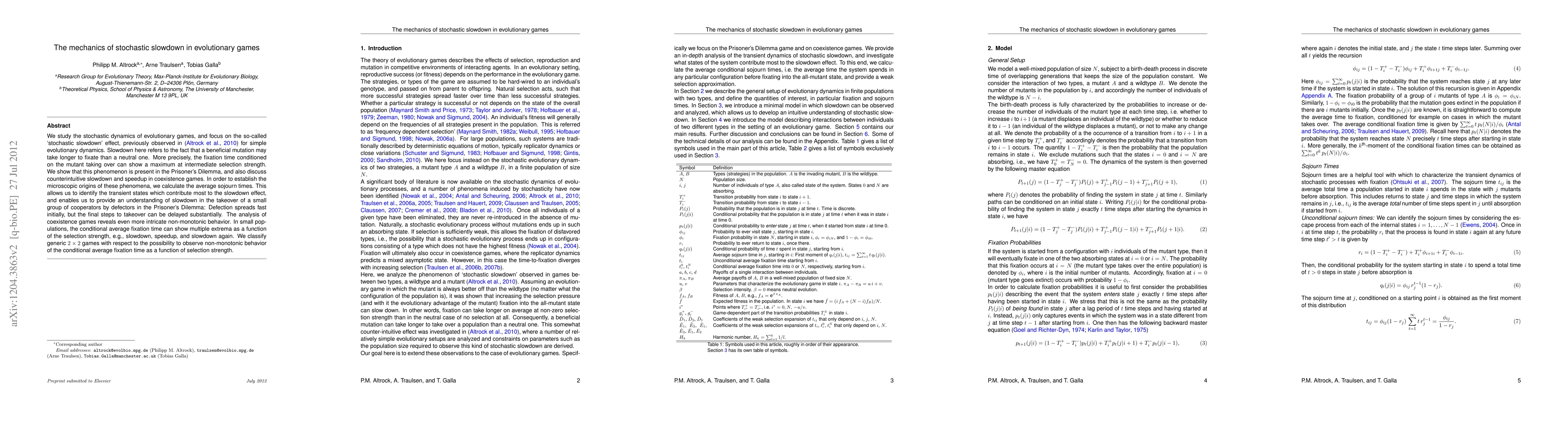 This paper investigates the stochastic dynamics of evolutionary games, focusing on the "stochastic slowdown" effect where beneficial mutations take longer to fixate than neutral ones. It identifies this phenomenon in the prisoner's dilemma and explores complex behaviors in coexistence games, revealing multiple extrema in conditional fixation times as a function of selection strength.