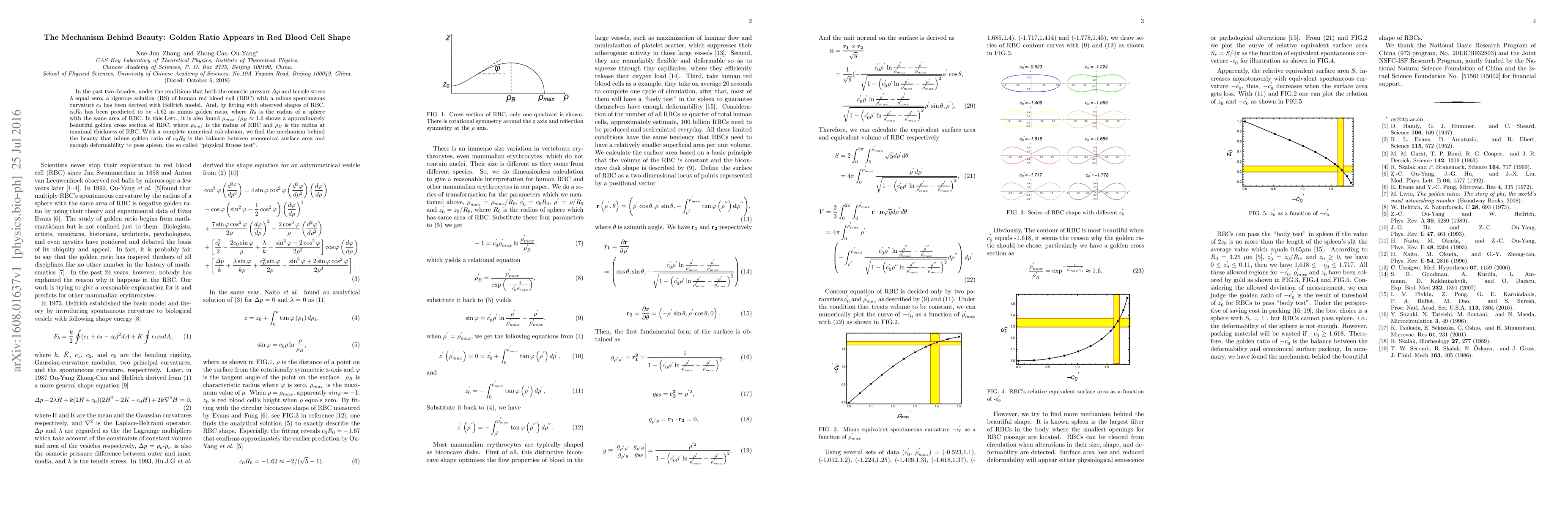 In the past two decades, under the conditions that both the osmotic pressure $\Delta p$ and tensile stress $\lambda$ equal zero, a rigorous solution (RS) of human red blood cell (RBC) with a minus spontaneous curvature $c_{0}$ has been derived with Helfrich model. And, by fitting with observed shapes of RBC, $c_{0}R_{0}$ has been predicted to be -1.62 as minus golden ratio, where $R_{0}$ is the radius of a sphere with the same area of RBC. In this Lett., it is also found $\rho_{max}$ /$\rho_{B}\approx$ 1.6 shows a approximately beautiful golden cross section of RBC, where $\rho_{max}$ is the radius of RBC and $\rho_{B}$ is the radius at maximal thickness of RBC. With a complete numerical calculation, we find the mechanism behind the beauty that minus golden ratio of $c_{0}R_{0}$ is the balance between economical surface area and enough deformability to pass spleen, the so called "physical fitness test".