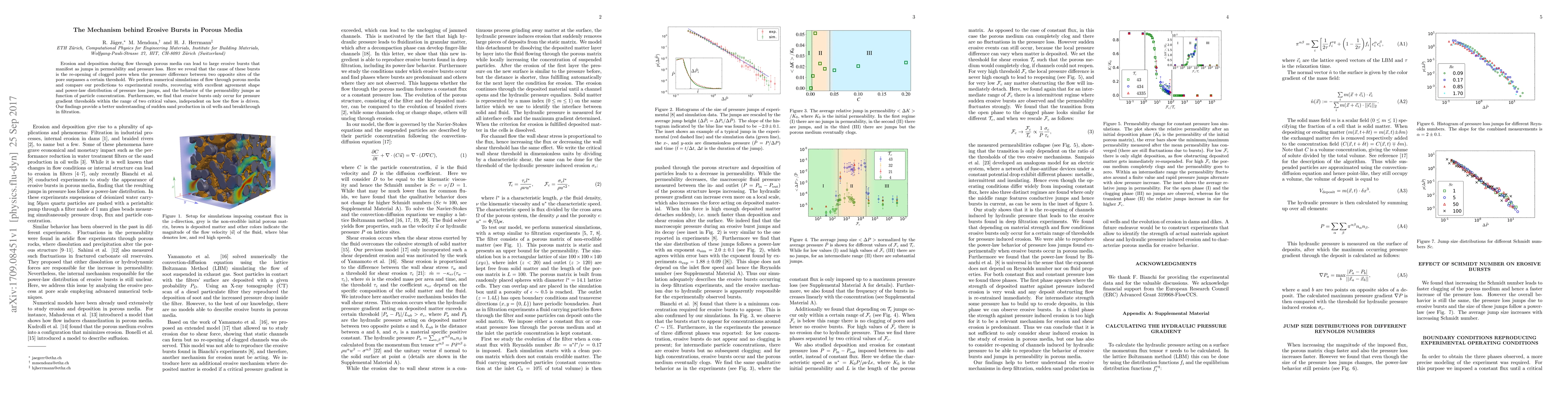 Erosion and deposition during flow through porous media can lead to large erosive bursts that manifest as jumps in permeability and pressure loss. Here we reveal that the cause of these bursts is the re-opening of clogged pores when the pressure difference between two opposite sites of the pore surpasses a certain threshold. We perform numerical simulations of flow through porous media and compare our predictions to experimental results, recovering with excellent agreement shape and power-law distribution of pressure loss jumps, and the behavior of the permeability jumps as function of particle concentration. Furthermore, we find that erosive bursts only occur for pressure gradient thresholds within the range of two critical values, independent on how the flow is driven. Our findings provide a better understanding of sudden sand production in oil wells and breakthrough in filtration.