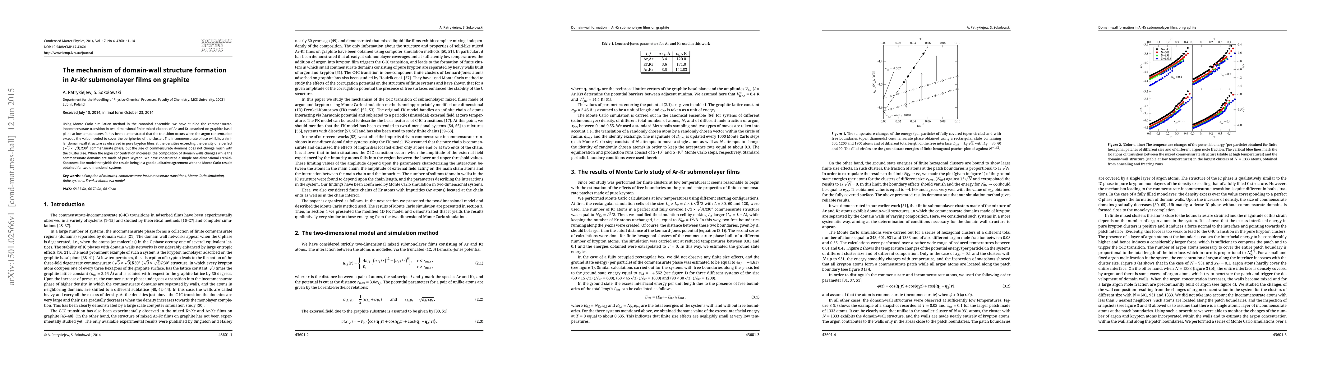 This study investigates the formation of domain-wall structures in Ar-Kr submonolayer films on graphite using Monte Carlo simulations, revealing a commensurate-incommensurate phase transition driven by argon concentration. The incommensurate phase shows domain-wall structures similar to pure krypton films, with commensurate domains primarily composed of krypton.
