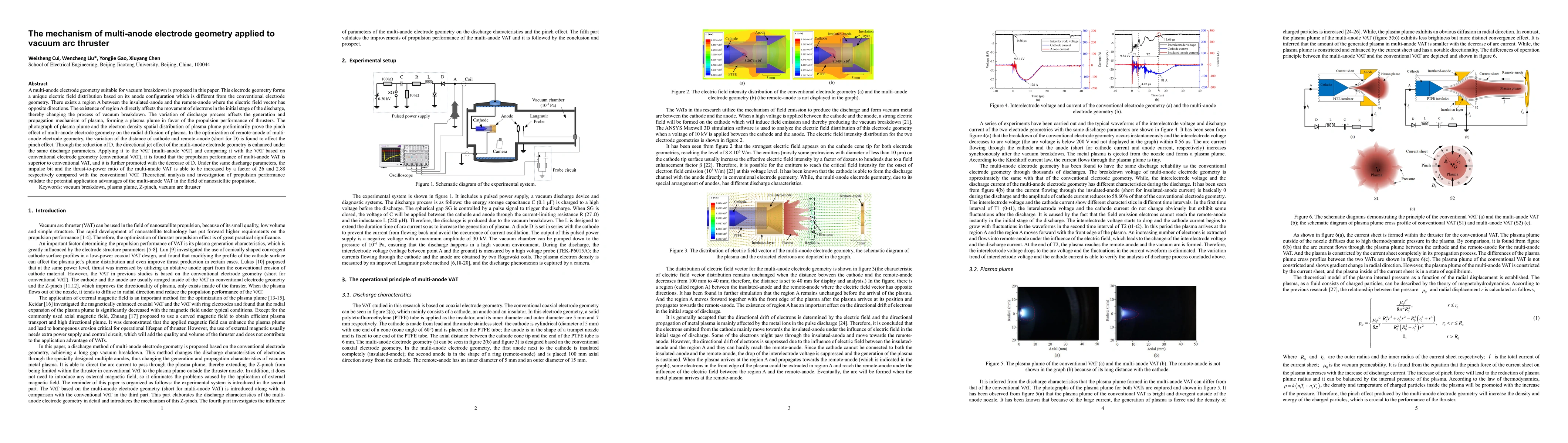 A multi-anode electrode geometry suitable for vacuum breakdown is proposed in this paper. This electrode geometry forms a unique electric field distribution based on its anode configuration which is different from the conventional electrode geometry. There exists a region A between the insulated-anode and the remote-anode where the electric field vector has opposite directions. The existence of region A directly affects the movement of electrons in the initial stage of the discharge, thereby changing the process of vacuum breakdown. The variation of discharge process affects the generation and propagation mechanism of plasma, forming a plasma plume in favor of the propulsion performance of thrusters. The photograph of plasma plume and the electron density spatial distribution of plasma plume preliminarily prove the pinch effect of multi-anode electrode geometry on the radial diffusion of plasma. In the optimization of remote-anode of multi-anode electrode geometry, the variation of the distance of cathode and remote-anode (short for D) is found to affect the pinch effect. Through the reduction of D, the directional jet effect of the multi-anode electrode geometry is enhanced under the same discharge parameters. Applying it to the VAT (multi-anode VAT) and comparing it with the VAT based on conventional electrode geometry (conventional VAT), it is found that the propulsion performance of multi-anode VAT is superior to conventional VAT, and it is further promoted with the decrease of D. Under the same discharge parameters, the impulse bit and the thrust-to-power ratio of the multi-anode VAT is able to be increased by a factor of 26 and 2.88 respectively compared with the conventional VAT. Theoretical analysis and investigation of propulsion performance validate the potential application advantages of the multi-anode VAT in the field of nanosatellite propulsion.