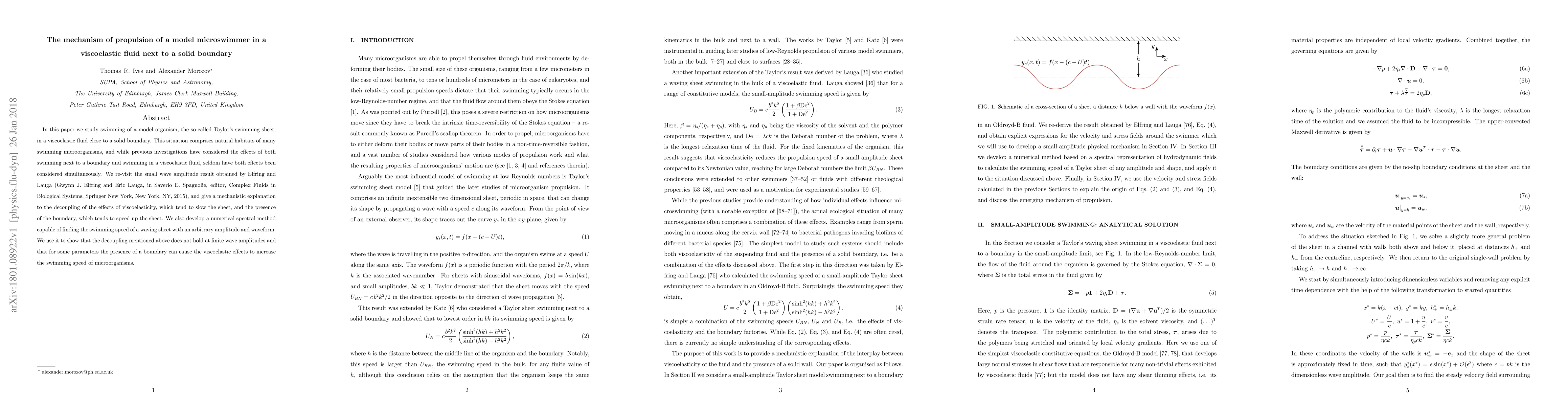 Researchers studied how a microswimmer moves in a fluid near a solid boundary, finding that viscoelasticity slows the swimmer but a boundary can actually speed it up at certain amplitudes.