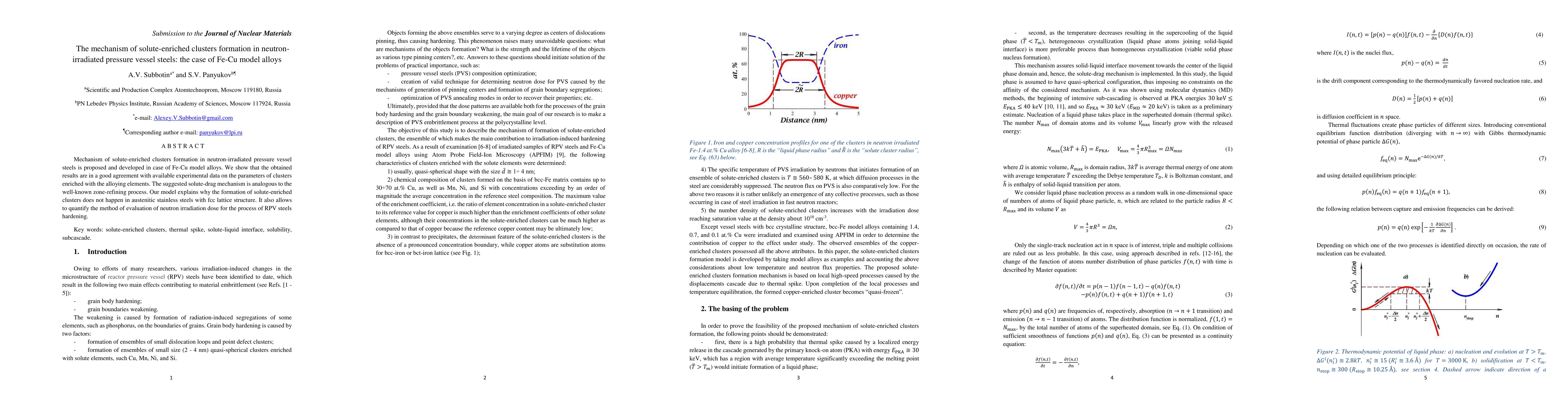 This paper proposes a mechanism for solute-enriched cluster formation in neutron-irradiated pressure vessel steels using Fe-Cu model alloys, demonstrating agreement with experimental data. The suggested solute-drag mechanism explains why such clusters do not form in austenitic stainless steels and provides a method for evaluating neutron irradiation dose for steel hardening.