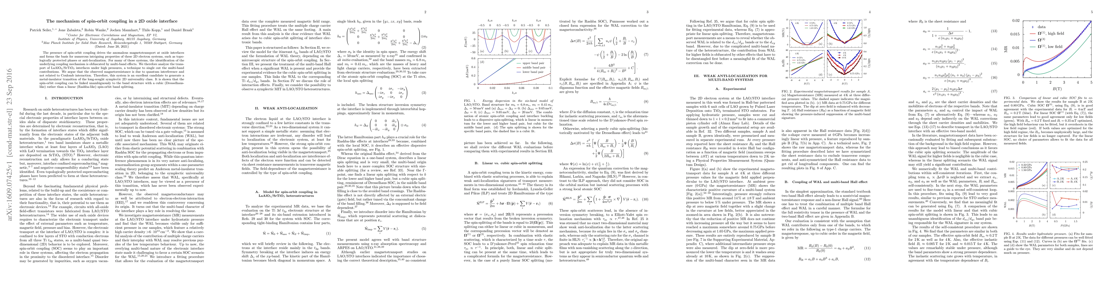 The presence of spin-orbit coupling drives the anomalous magnetotransport at oxide interfaces and forms the basis for numerous intriguing properties of these 2D electron systems, such as topologically protected phases or anti-localization. For many of those systems, the identification of the underlying coupling mechanism is obfuscated by multi-band effects. We therefore analyze the transport of LaAlO$_3$/SrTiO$_3$ interfaces under high pressures, a technique to single out the multi-band contributions. We argue that the observed magnetoresistance is due to quantum interference and not related to Coulomb interaction. Therefore, this system is an excellent candidate to generate a metal-insulator transition of the long-sought symplectic 2D universality class. It is shown that the spin-orbit coupling can be linked unambiguously to the band structure with a cubic (Dresselhaus-like) rather than a linear (Rashba-like) spin-orbit band splitting.