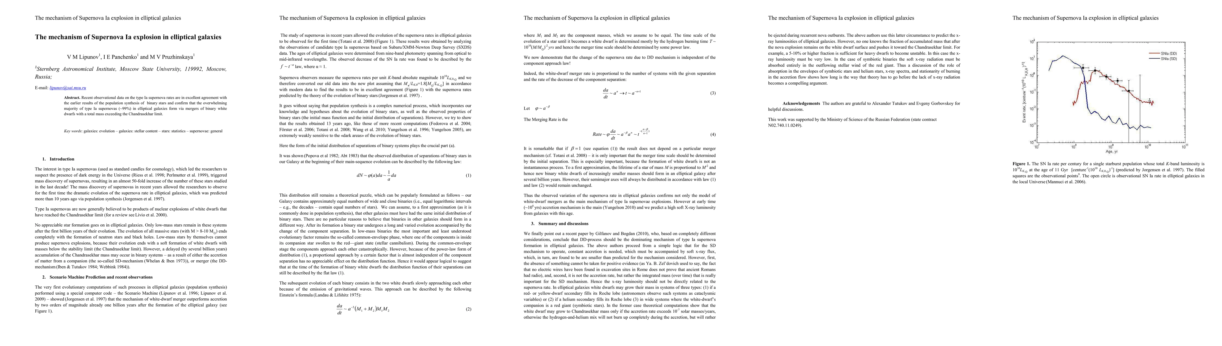 Summary: Recent observations confirm that the majority of type Ia supernovae in elliptical galaxies result from the merger of binary white dwarfs, exceeding the Chandrasekhar limit, aligning with predictions from binary star population synthesis models. This mechanism explains the high rate of these supernovae.