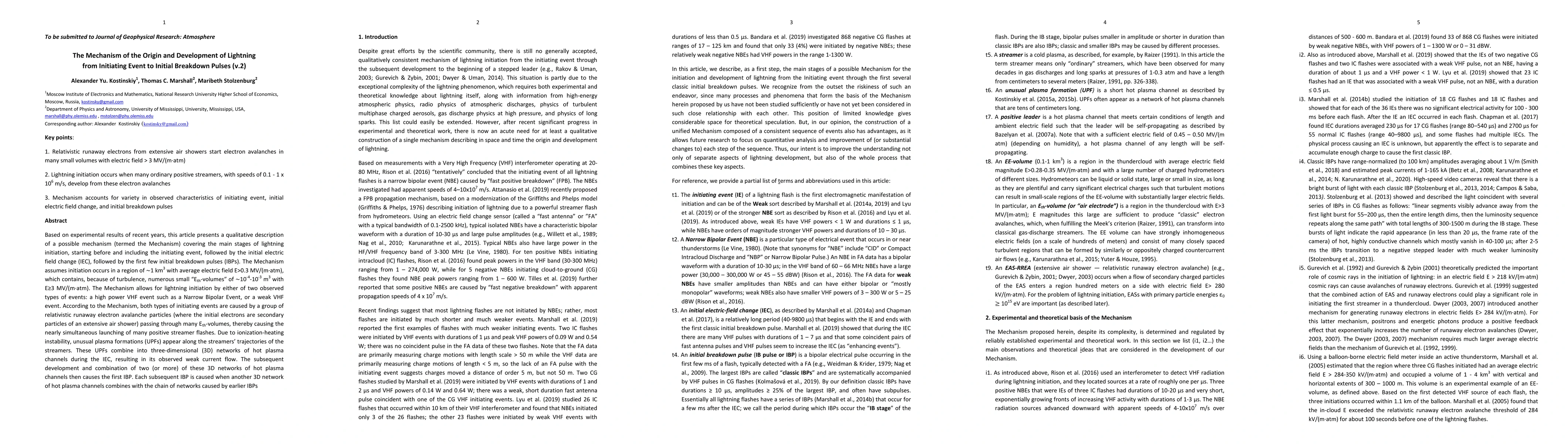 This paper proposes a mechanism for lightning initiation and development, suggesting it begins in a small, highly charged region within a thunderstorm cloud. Initiating events, whether high or weak, are caused by relativistic electrons triggering numerous streamer flashes. These flashes form 3D hot plasma channels, leading to initial electric field changes (IEC) and subsequent initial breakdown pulses (IBPs).