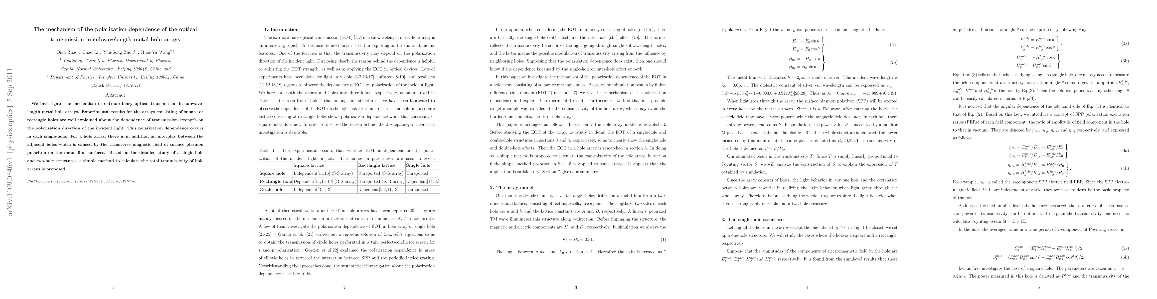 Researchers studied the polarization dependence of light transmission in metal hole arrays, discovering that it occurs due to a transverse magnetic field on metal film surfaces. They proposed a simple method to calculate total transmission for such arrays.