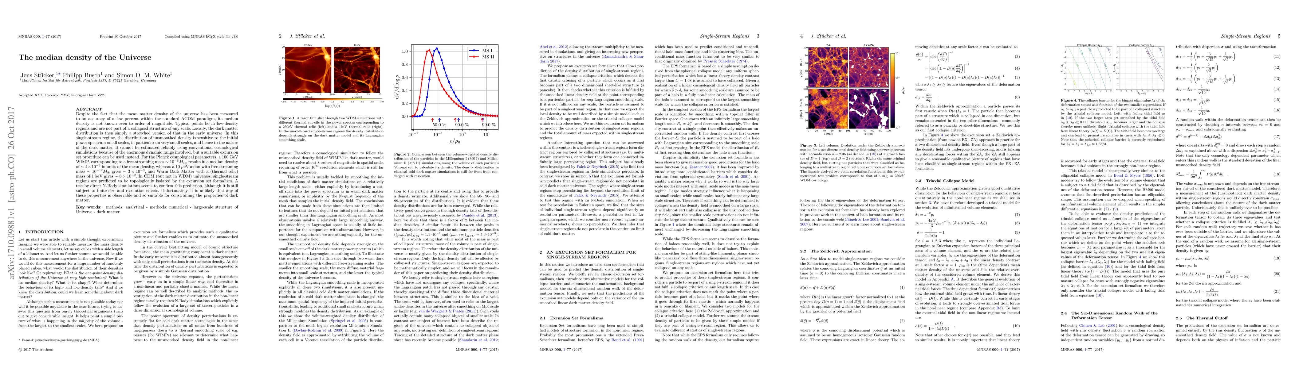 Despite the fact that the mean matter density of the universe has been measured to an accuracy of a few percent within the standard $\Lambda$CDM paradigm, its median density is not known even to order of magnitude. Typical points lie in low-density regions and are not part of a collapsed structure of any scale. Locally, the dark matter distribution is then simply a stretched version of that in the early universe. In this single-stream regime, the distribution of unsmoothed density is sensitive to the initial power spectrum on all scales, in particular on very small scales, and hence to the nature of the dark matter. It cannot be estimated reliably using conventional cosmological simulations because of the enormous dynamic range involved, but a suitable excursion set procedure can be used instead. For the Planck cosmological parameters, a 100 GeV WIMP, corresponding to a free-streaming mass $\sim 10^{-6}M_\odot$, results in a median density of $\sim 4\times 10^{-3}$ in units of the mean density, whereas a 10 $\mu$eV axion with free-streaming mass $\sim 10^{-12}M_\odot$ gives $\sim 3\times 10^{-3}$, and Warm Dark Matter with a (thermal relic) mass of 1 keV gives $\sim 8\times 10^{-2}$. In CDM (but not in WDM) universes, single-stream regions are predicted to be topologically isolated by the excursion set formalism. A test by direct N-Body simulations seems to confirm this prediction, although it is still subject to finite size and resolution effects. Unfortunately, it is unlikely that any of these properties is observable and so suitable for constraining the properties of dark matter.