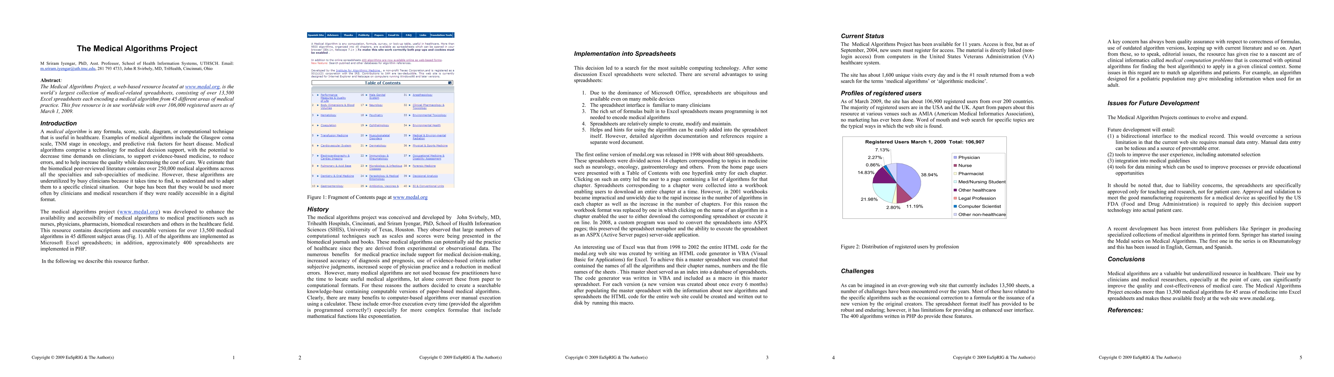 The Medical Algorithms Project, a web-based resource located at www.medal.org, is the world's largest collection of medical-related spreadsheets, consisting of over 13,500 Excel spreadsheets each encoding a medical algorithm from 45 different areas of medical practice. This free resource is in use worldwide with over 106,000 registered users as of March 1, 2009.