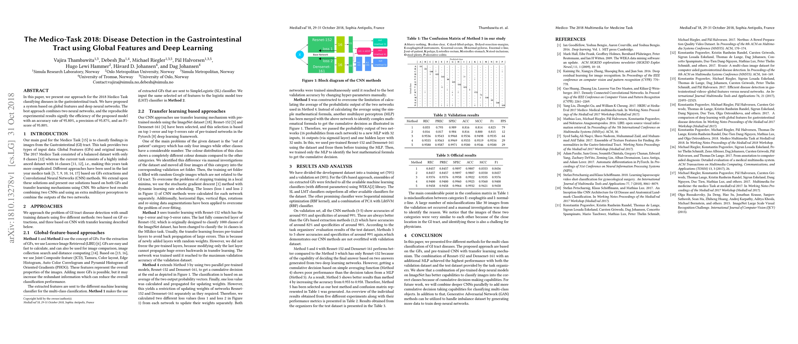 In this paper, we present our approach for the 2018 Medico Task classifying diseases in the gastrointestinal tract. We have proposed a system based on global features and deep neural networks. The best approach combines two neural networks, and the reproducible experimental results signify the efficiency of the proposed model with an accuracy rate of 95.80%, a precision of 95.87%, and an F1-score of 95.80%.