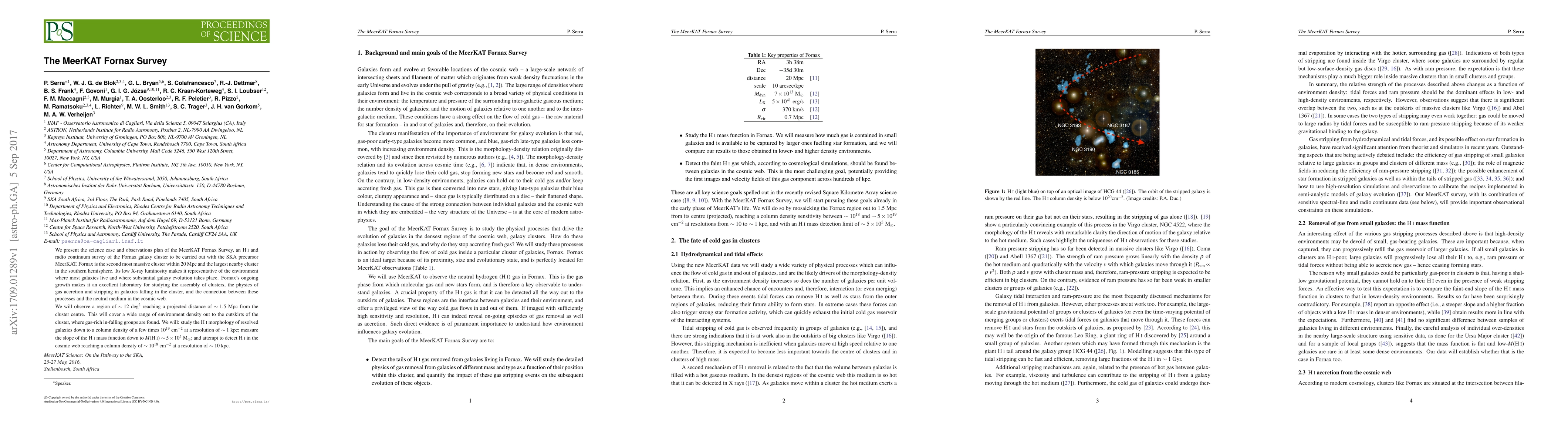 The MeerKAT Fornax Survey aims to study the Fornax galaxy cluster using HI and radio continuum observations, focusing on galaxy evolution, cluster assembly, and gas accretion processes. The survey will cover 12 deg$^2$ with a resolution of 1 kpc, targeting HI morphology and mass function down to specific column densities.