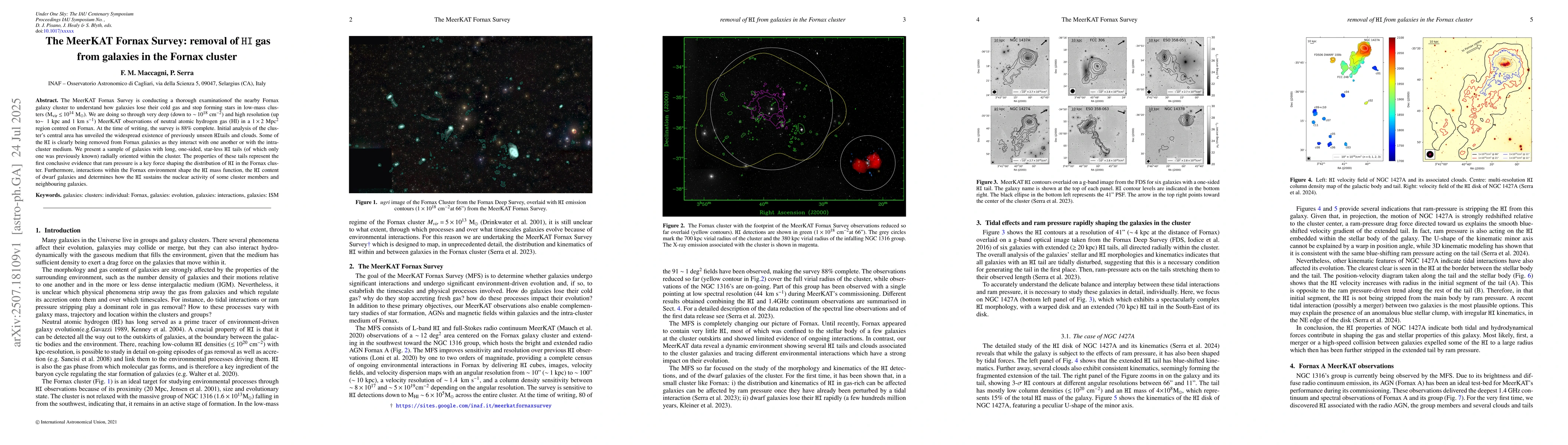 The MeerKAT Fornax Survey reveals previously unseen HI gas tails and clouds in the Fornax cluster, showing ram pressure as a key force stripping galaxies of their cold gas and halting star formation. The survey, 88% complete, uncovers unique one-sided, starless HI tails, demonstrating environmental impact on galaxies' HI mass, content, and nuclear activity within low-mass clusters.