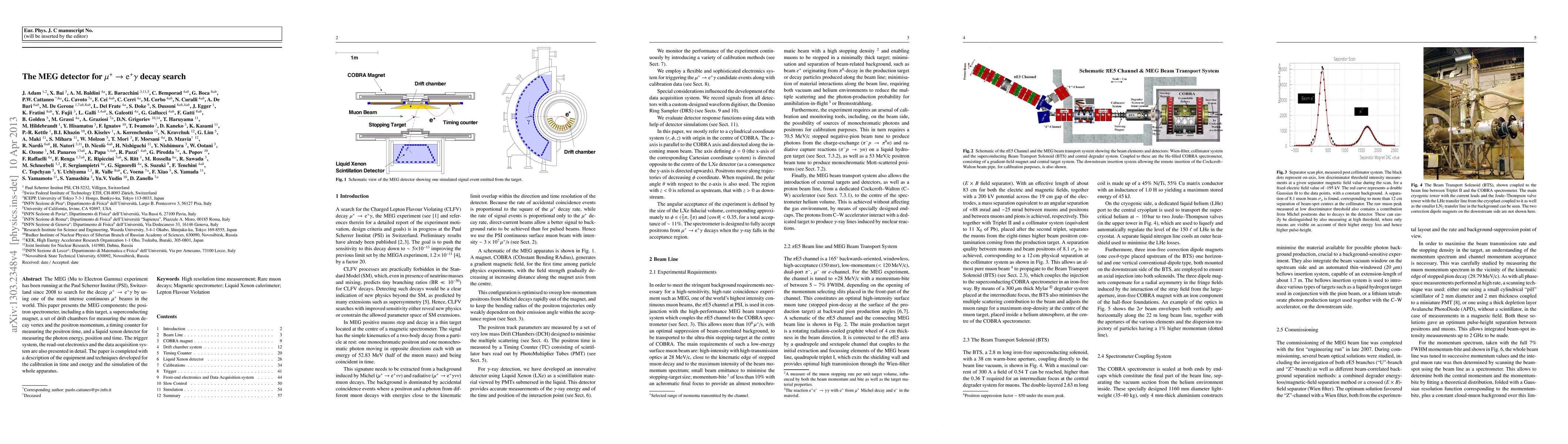 The MEG experiment at PSI uses a sophisticated setup to search for the rare decay $\mu^+ \to e^+ \gamma$, including a positron spectrometer, superconducting magnet, and liquid xenon detector, with detailed descriptions of the trigger system, electronics, and calibration techniques. The paper also outlines the simulation methods employed to analyze the apparatus.