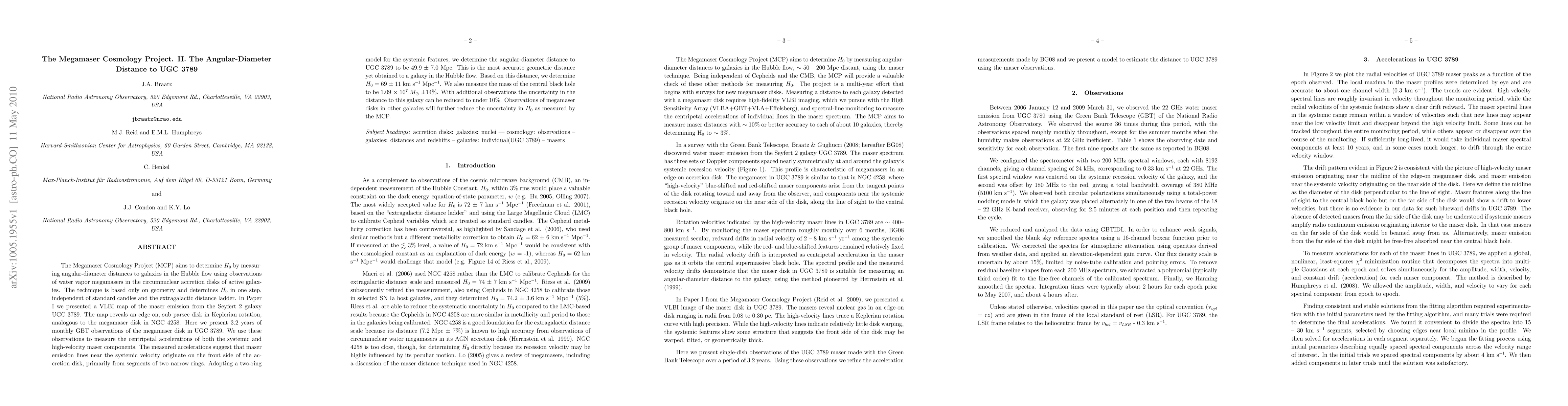The Megamaser Cosmology Project (MCP) aims to determine H0 by measuring angular-diameter distances to galaxies in the Hubble flow using observations of water vapor megamasers in the circumnuclear accretion disks of active galaxies. The technique is based only on geometry and determines H0 in one step, independent of standard candles and the extragalactic distance ladder. In Paper I we presented a VLBI map of the maser emission from the Seyfert 2 galaxy UGC 3789. The map reveals an edge-on, sub-parsec disk in Keplerian rotation, analogous to the megamaser disk in NGC 4258. Here we present 3.2 years of monthly GBT observations of the megamaser disk in UGC 3789. We use these observations to measure the centripetal accelerations of both the systemic and high-velocity maser components. The measured accelerations suggest that maser emission lines near the systemic velocity originate on the front side of the accretion disk, primarily from segments of two narrow rings. Adopting a two-ring model for the systemic features, we determine the angular-diameter distance to UGC 3789 to be 49.9 +/- 7.0 Mpc. This is the most accurate geometric distance yet obtained to a galaxy in the Hubble flow. Based on this distance, we determine H0 = 69 +/- 11 km/s/Mpc. We also measure the mass of the central black hole to be 1.09 x 10^7 solar masses +/- 14%. With additional observations the uncertainty in the distance to this galaxy can be reduced to under 10%. Observations of megamaser disks in other galaxies will further reduce the uncertainty in H0 as measured by the MCP.