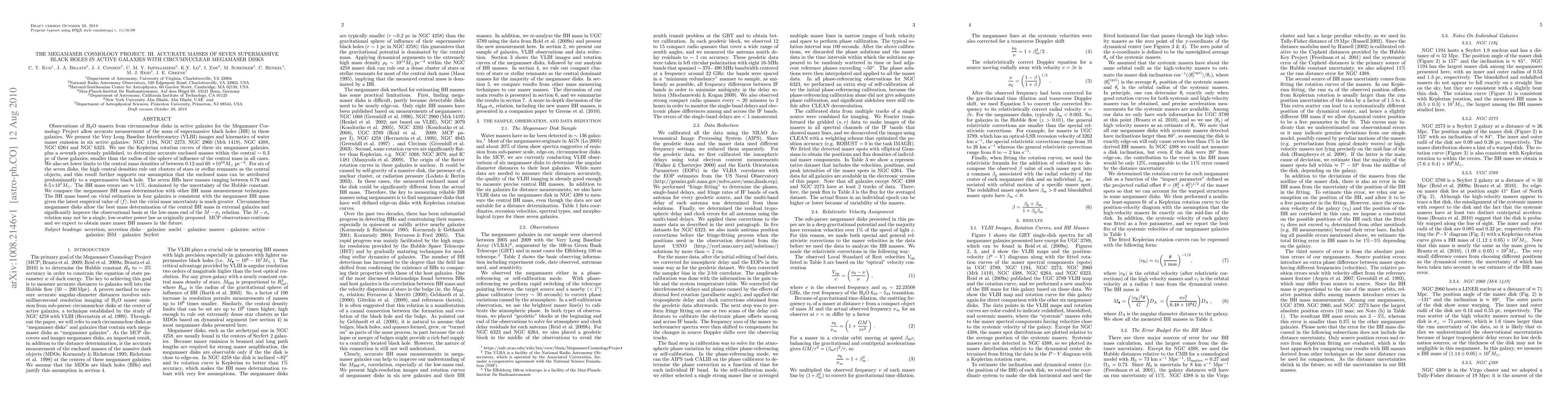 Observations of H$_2$O masers from circumnuclear disks in active galaxies for the Megamaser Cosmology Project allow accurate measurement of the mass of supermassive black holes (BH) in these galaxies. We present the Very Long Baseline Interferometry (VLBI) images and kinematics of water maser emission in six active galaxies: NGC~1194, NGC~2273, NGC~2960 (Mrk~1419), NGC~4388, NGC~6264 and NGC~6323. We use the Keplerian rotation curves of these six megamaser galaxies, plus a seventh previously published, to determine accurate enclosed masses within the central $\sim0.3$ pc of these galaxies, smaller than the radius of the sphere of influence of the central mass in all cases. We also set lower limits to the central mass densities of between 0.12 and 60 $\times 10^{10} M_{\odot}$~pc$^{-3}$. For six of the seven disks, the high central densities rule out clusters of stars or stellar remnants as the central objects, and this result further supports our assumption that the enclosed mass can be attributed predominantly to a supermassive black hole. The seven BHs have masses ranging between 0.76 and 6.5$\times$10$^7 M_{\odot}$. The BH mass errors are $\approx11$\%, dominated by the uncertainty of the Hubble constant. We compare the megamaser BH mass determination with other BH mass measurement techniques. The BH mass based on virial estimation in four galaxies is consistent with the megamaser BH mass given the latest empirical value of $\langle f \rangle$, but the virial mass uncertainty is much greater. MCP observations continue and we expect to obtain more maser BH masses in the future.