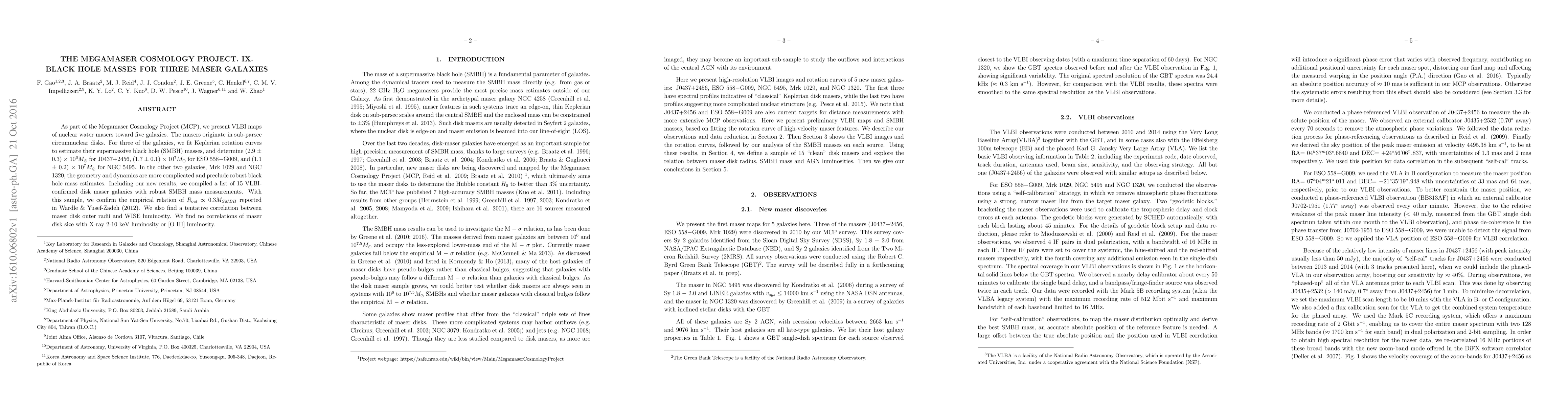 This paper estimates supermassive black hole masses for three galaxies using VLBI maps of nuclear water masers, finding masses of (2.9 $\pm$ 0.3) $\times~10^{6}M_\odot$, (1.7 $\pm$ 0.1) $\times~10^{7}M_\odot$, and (1.1 $\pm$ 0.2) $\times~10^{7}M_\odot$ for J0437+2456, ESO 558-G009, and NGC 5495, respectively. The study also confirms the empirical relation $R_{out} \propto 0.3 M_{SMBH}$ and finds a tentative correlation between maser disk outer radii and WISE luminosity.