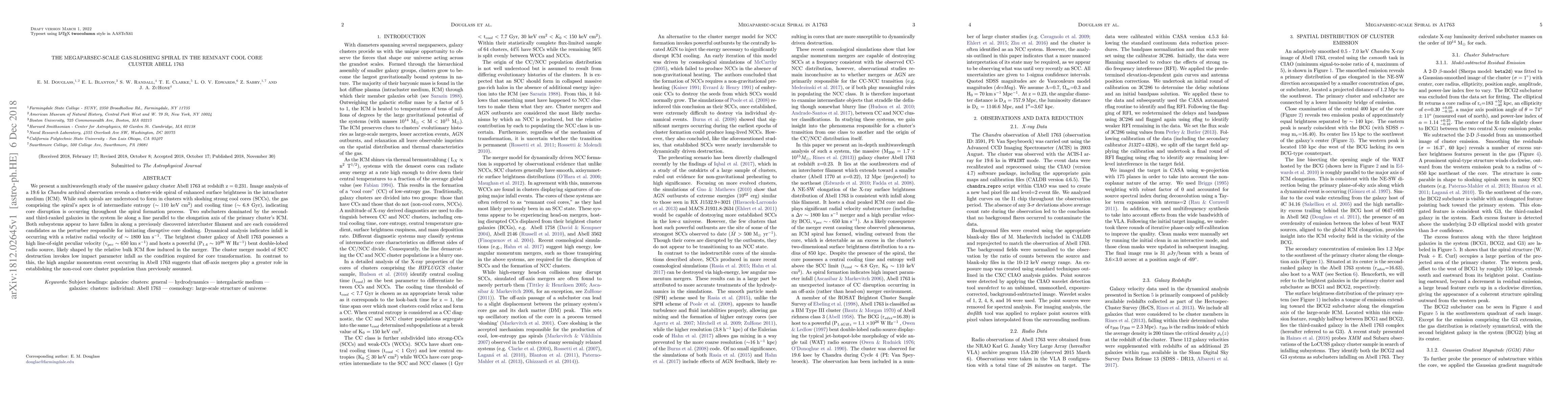 We present a multiwavelength study of the massive galaxy cluster Abell 1763 at redshift z = 0.231. Image analysis of a 19.6 ks Chandra archival observation reveals a cluster-wide spiral of enhanced surface brightness in the intracluster medium (ICM). While such spirals are understood to form in clusters with sloshing strong cool cores (SCCs), the gas comprising the spiral's apex is of intermediate entropy ($\sim$ 110 keV cm$^{2}$) and cooling time ($\sim$ 6.8 Gyr), indicating core disruption is occurring throughout the spiral formation process. Two subclusters dominated by the second- and third-ranked galaxies in the system lie along a line parallel to the elongation axis of the primary cluster's ICM. Both subsystems appear to have fallen in along a previously discovered intercluster filament and are each considered candidates as the perturber responsible for initiating disruptive core sloshing. Dynamical analysis indicates infall is occurring with a relative radial velocity of $\sim$ 1800 km s$^{-1}$. The brightest cluster galaxy of Abell 1763 possesses a high line-of-sight peculiar velocity (v$_{pec}$ $\sim$ 650 km s$^{-1}$) and hosts a powerful (P$_{1.4}$ $\sim$ 10$^{26}$ W Hz$^{-1}$) bent double-lobed radio source, likely shaped by the relative bulk ICM flow induced in the merger. The cluster merger model of SCC destruction invokes low impact parameter infall as the condition required for core transformation. In contrast to this, the high angular momentum event occurring in Abell 1763 suggests that off-axis mergers play a greater role in establishing the non-cool core cluster population than previously assumed.