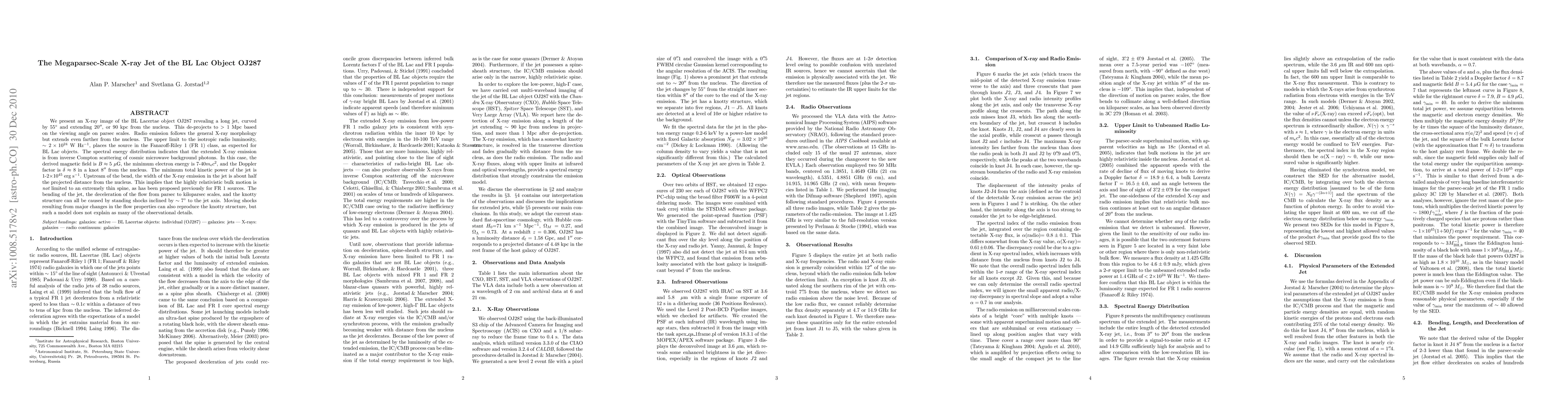 The OJ287 BL Lacertae object features a 90 kpc-long curved X-ray jet with a magnetic field of ~5 microGauss, while radio emission extends farther from the nucleus, indicating an FR 1 class source.
