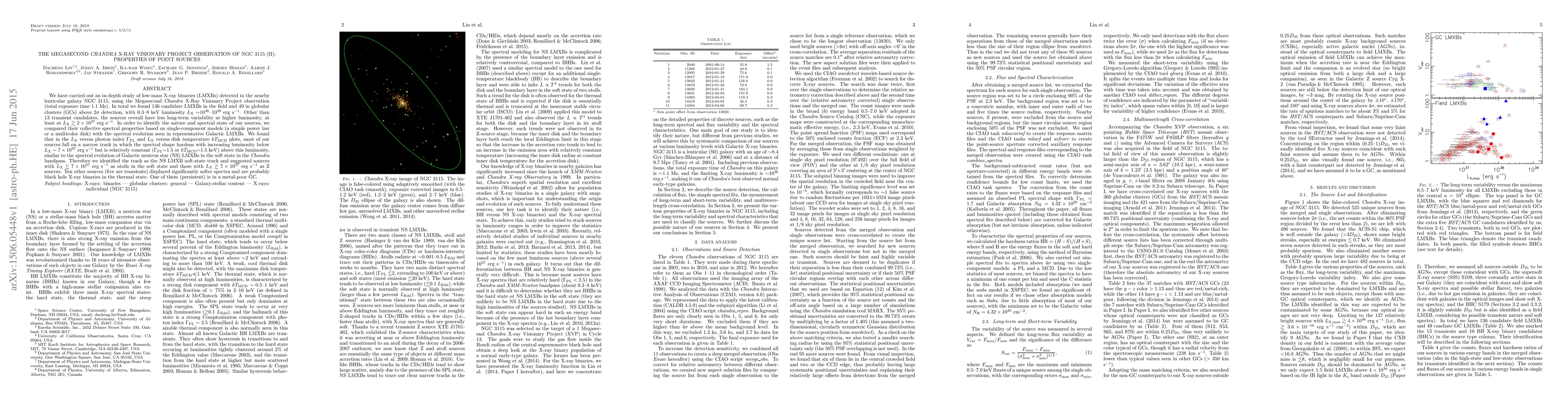 We have carried out an in-depth study of low-mass X-ray binaries (LMXBs) detected in the nearby lenticular galaxy NGC 3115, using the Megasecond Chandra X-Ray Visionary Project observation (total exposure time 1.1 Ms). In total we found 136 candidate LMXBs in the field and 49 in globular clusters (GCs) above 2\sigma\ detection, with 0.3--8 keV luminosity L_X ~10^36-10^39 erg/s. Other than 13 transient candidates, the sources overall have less long-term variability at higher luminosity, at least at L_X > 2x10^37 erg/s. In order to identify the nature and spectral state of our sources, we compared their collective spectral properties based on single-component models (a simple power law or a multicolor disk) with the spectral evolution seen in representative Galactic LMXBs. We found that in the L_X versus photon index \Gamma_PL and L_X versus disk temperature kT_MCD plots, most of our sources fall on a narrow track in which the spectral shape hardens with increasing luminosity below L_X~7x10^37 erg/s but is relatively constant (\Gamma_PL~1.5 or kT_MCD~1.5 keV) above this luminosity, similar to the spectral evolution of Galactic neutron star (NS) LMXBs in the soft state in the Chandra bandpass. Therefore we identified the track as the NS LMXB soft-state track and suggested sources with L_X<7x10^37 erg/s as atolls in the soft state and those with L_X>7x10^37 erg/s as Z sources. Ten other sources (five are transients) displayed significantly softer spectra and are probably black hole X-ray binaries in the thermal state. One of them (persistent) is in a metal-poor GC.