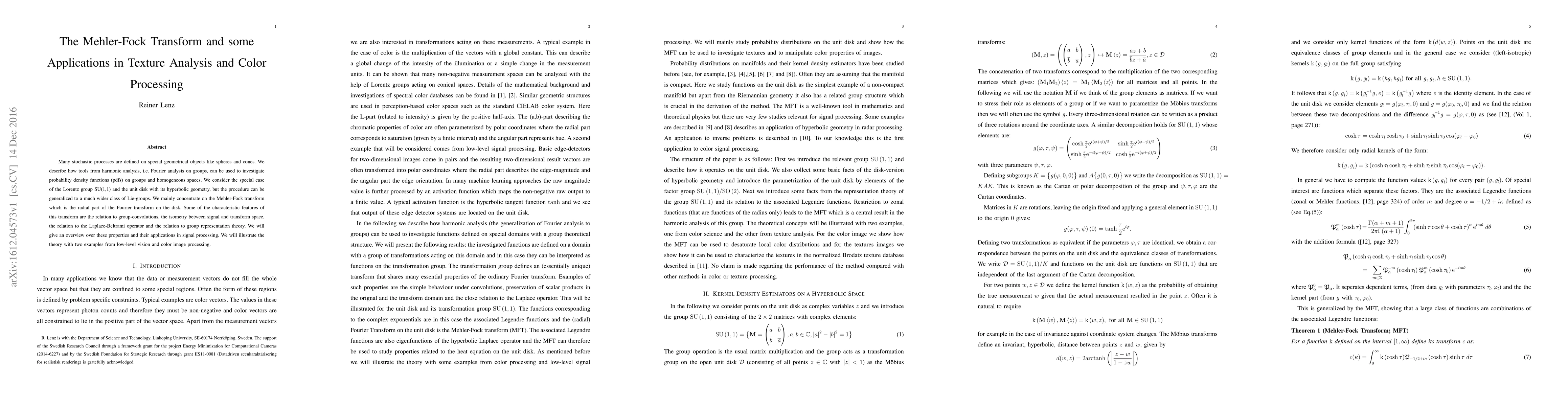 Researchers used harmonic analysis to study probability density functions on groups, focusing on the Mehler-Fock transform with applications in texture analysis and color processing.