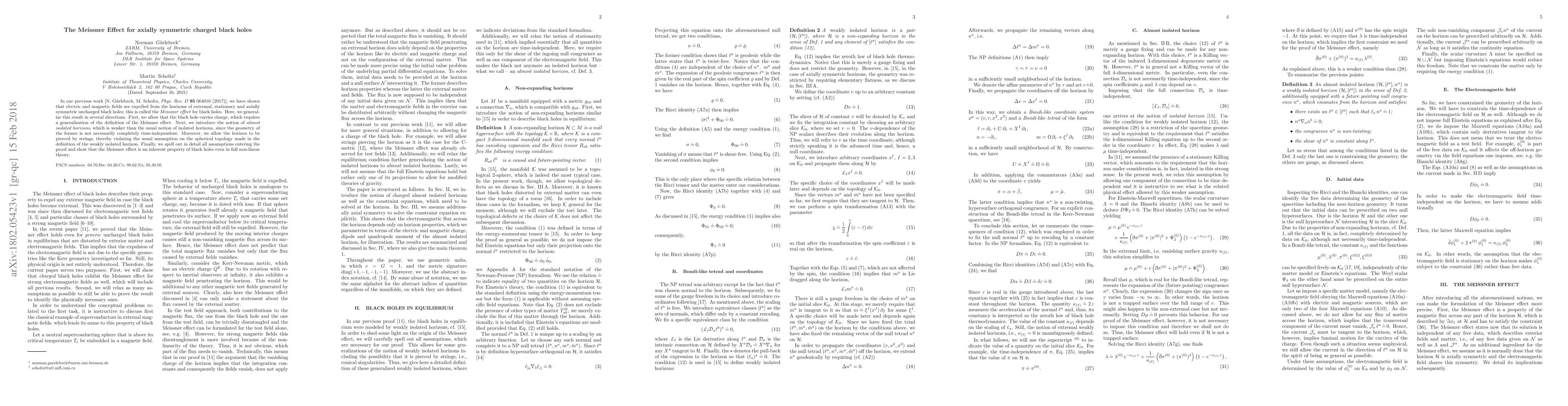 This paper generalizes the Meissner effect for black holes to include axially symmetric, charged black holes, demonstrating that electric and magnetic fields are expelled from their horizons. It also introduces almost isolated horizons and allows for horizon piercing by strings, confirming the Meissner effect's validity in non-linear theory.