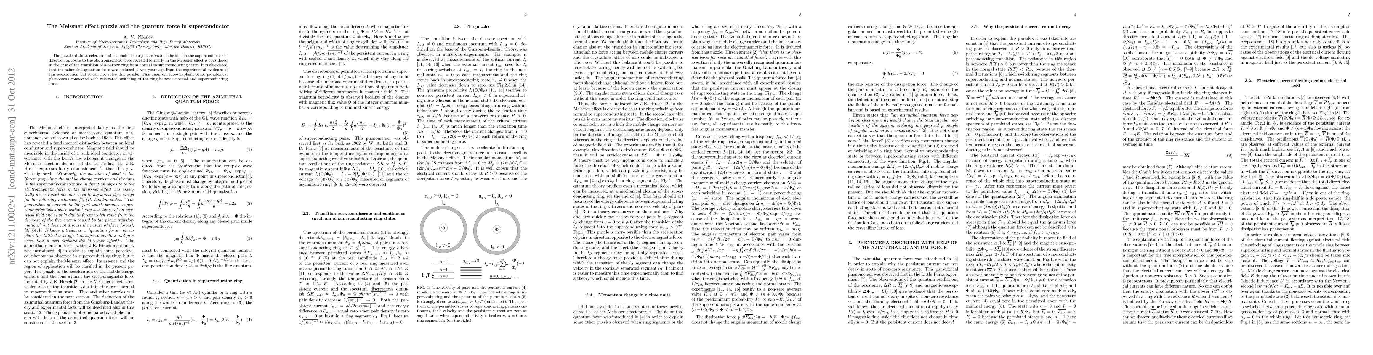 The puzzle of the acceleration of the mobile charge carriers and the ions in the superconductor in direction opposite to the electromagnetic force revealed formerly in the Meissner effect is considered in the case of the transition of a narrow ring from normal to superconducting state. It is elucidated that the azimuthal quantum force was deduced eleven years ago from the experimental evidence of this acceleration but it can not solve this puzzle. This quantum force explains other paradoxical phenomena connected with reiterated switching of the ring between normal and superconducting states.