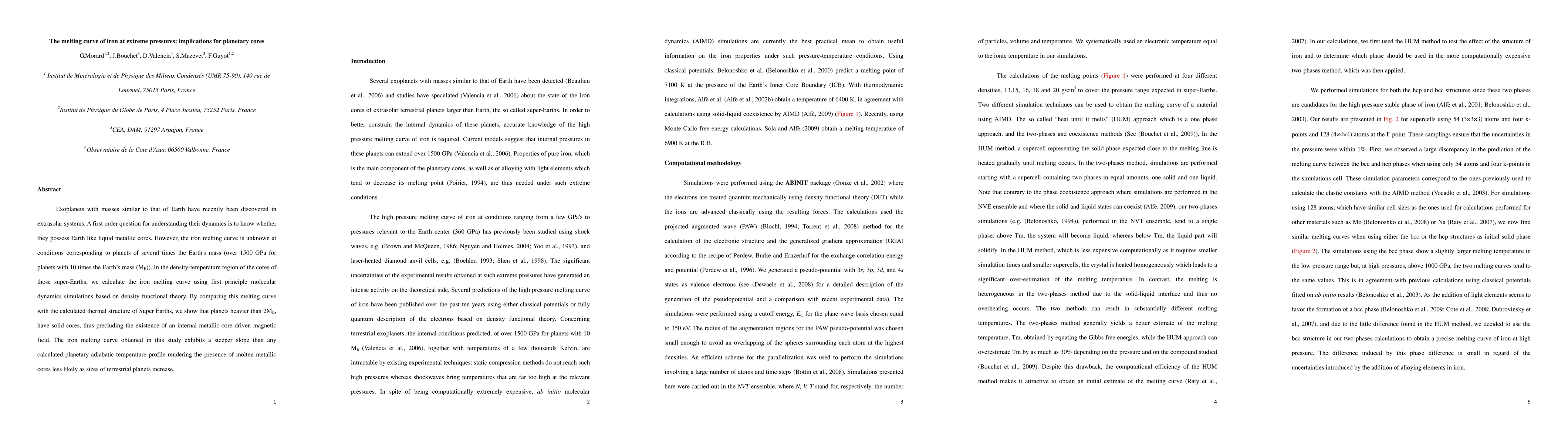 This study calculates the melting curve of iron at extreme pressures using first-principle simulations, revealing that super-Earths with masses over twice that of Earth likely have solid metallic cores, which impacts their magnetic field generation potential. The derived melting curve shows a steeper slope than planetary adiabatic temperature profiles, making molten cores less probable in larger terrestrial planets.