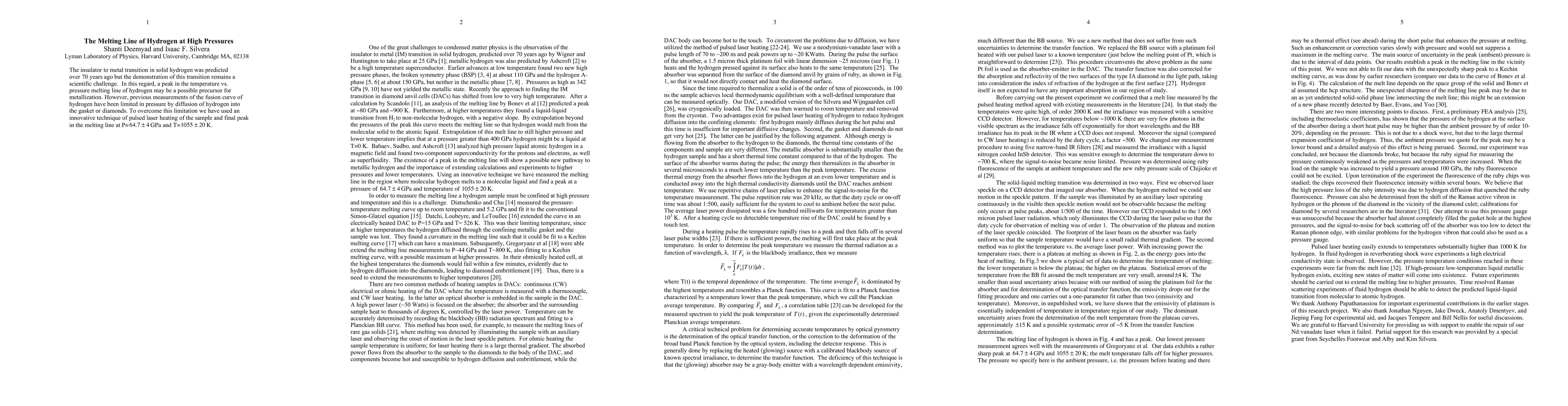 This study investigates the melting line of hydrogen under high pressures, identifying a peak at 64.7±4 GPa and 1055±20 K, which may indicate the precursor to the insulator to metal transition in solid hydrogen. The researchers utilized pulsed laser heating to overcome previous limitations in pressure measurements.