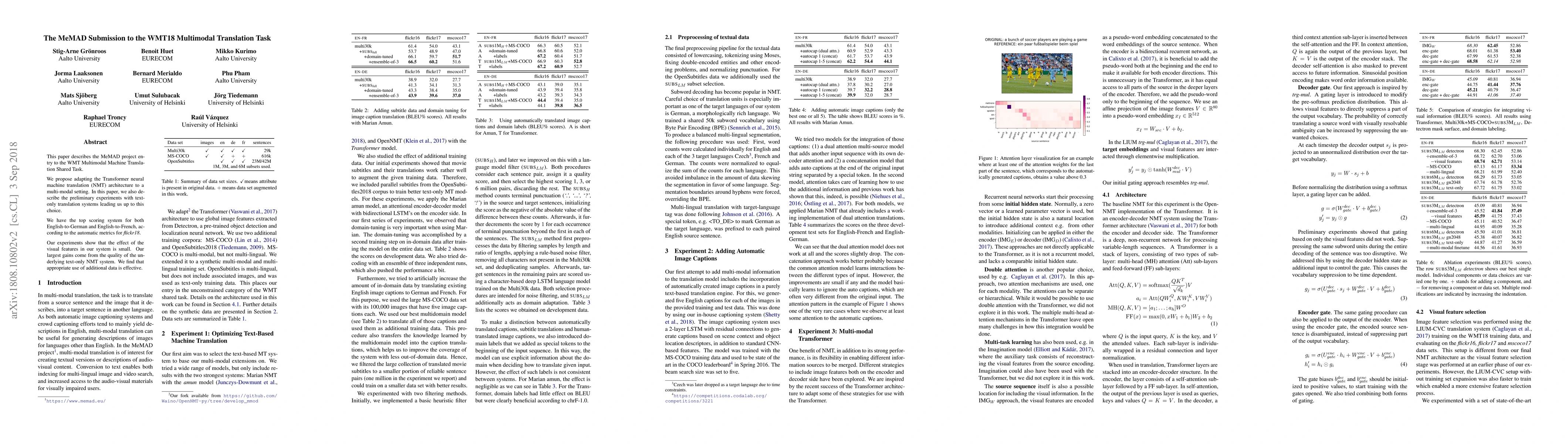 The MeMAD project adapted the Transformer architecture for multimodal translation in the WMT18 task, achieving top scores in English-to-German and English-to-French translations. Despite minimal impact from visual features, the success largely stemmed from the quality of the underlying text-only neural machine translation system.
