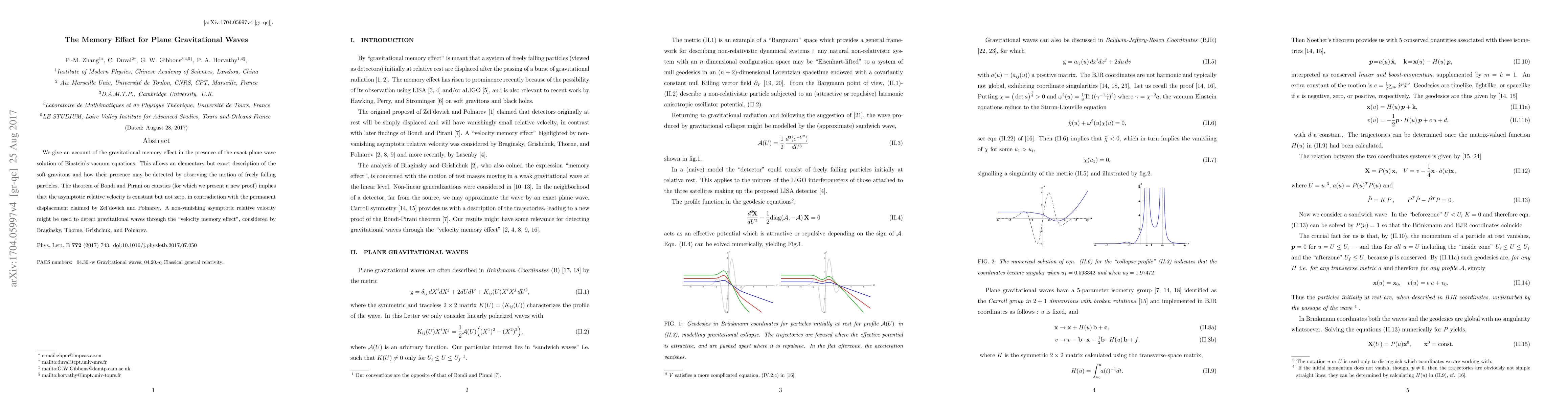 The paper discusses the gravitational memory effect from plane gravitational waves, providing an exact description of soft gravitons and their detection through particle motion. It disproves the permanent displacement claim and proposes a "velocity memory effect" for gravitational wave detection.