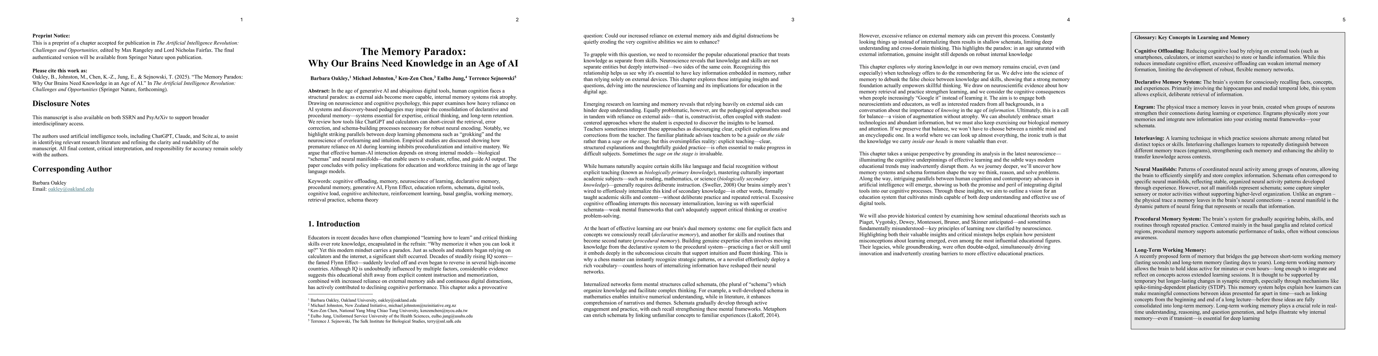 In the age of generative AI and ubiquitous digital tools, human cognition faces a structural paradox: as external aids become more capable, internal memory systems risk atrophy. Drawing on neuroscience and cognitive psychology, this paper examines how heavy reliance on AI systems and discovery-based pedagogies may impair the consolidation of declarative and procedural memory -- systems essential for expertise, critical thinking, and long-term retention. We review how tools like ChatGPT and calculators can short-circuit the retrieval, error correction, and schema-building processes necessary for robust neural encoding. Notably, we highlight striking parallels between deep learning phenomena such as "grokking" and the neuroscience of overlearning and intuition. Empirical studies are discussed showing how premature reliance on AI during learning inhibits proceduralization and intuitive mastery. We argue that effective human-AI interaction depends on strong internal models -- biological "schemata" and neural manifolds -- that enable users to evaluate, refine, and guide AI output. The paper concludes with policy implications for education and workforce training in the age of large language models.