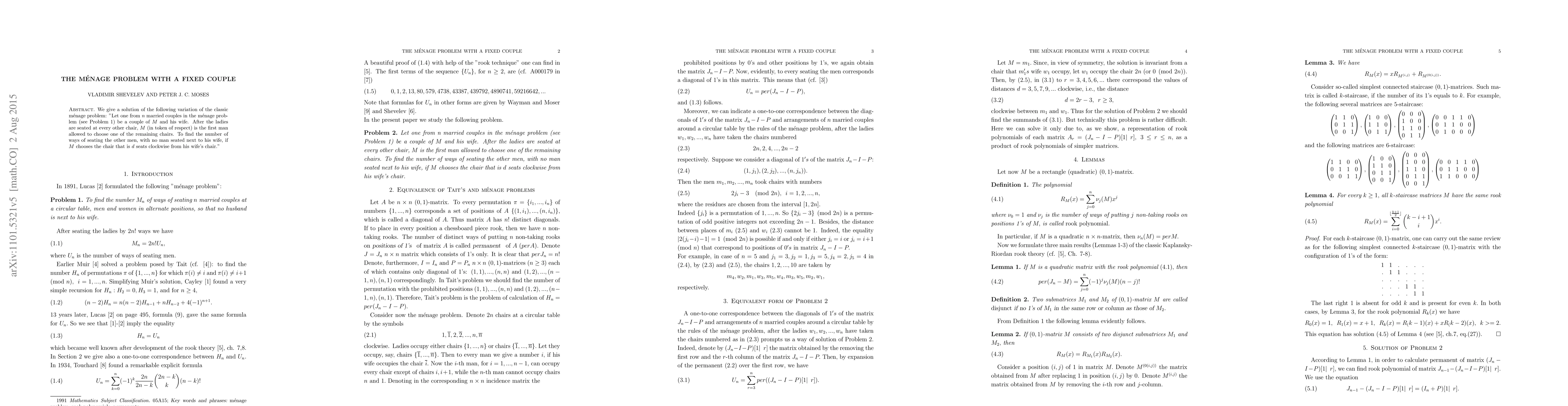 This paper solves the combinatorial ménage problem where one couple is a known mathematician and his wife, with the mathematician choosing a chair $d$ seats clockwise from his wife. The study determines the number of ways to seat the remaining men such that no man sits next to his wife.