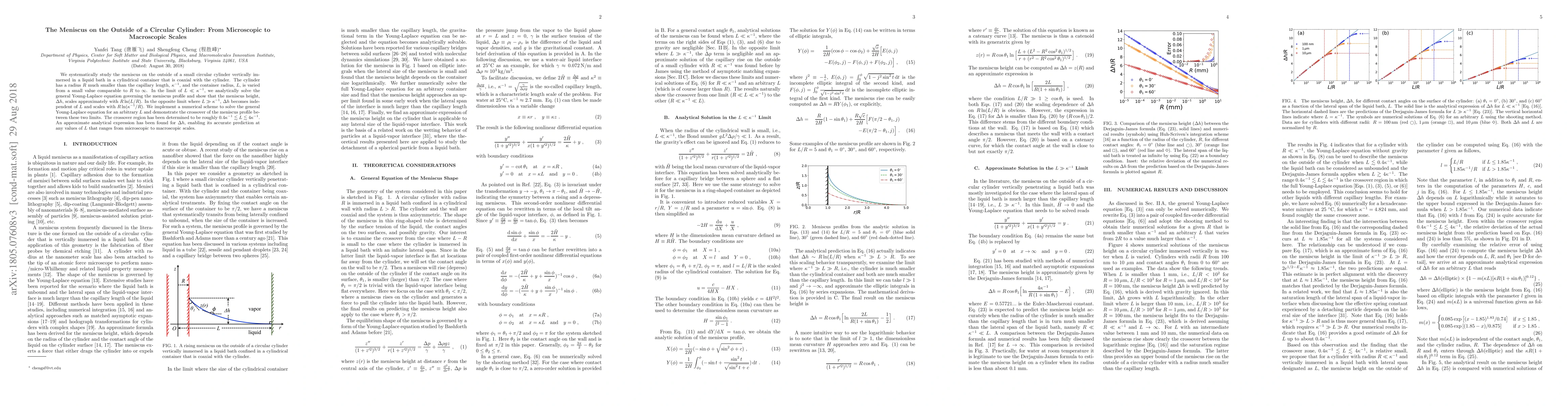 We systematically study the meniscus on the outside of a small circular cylinder vertically immersed in a liquid bath in a cylindrical container that is coaxial with the cylinder. The cylinder has a radius $R$ much smaller than the capillary length, $\kappa^{-1}$, and the container radius, $L$, is varied from a small value comparable to $R$ to $\infty$. In the limit of $L \ll \kappa^{-1}$, we analytically solve the general Young-Laplace equation governing the meniscus profile and show that the meniscus height, $\Delta h$, scales approximately with $R\ln (L/R)$. In the opposite limit where $L \gg \kappa^{-1}$, $\Delta h$ becomes independent of $L$ and scales with $R\ln (\kappa^{-1}/R)$. We implement a numerical scheme to solve the general Young-Laplace equation for an arbitrary $L$ and demonstrate the crossover of the meniscus profile between these two limits. The crossover region has been determined to be roughly $0.4\kappa^{-1} \lesssim L \lesssim 4\kappa^{-1}$. An approximate analytical expression has been found for $\Delta h$, enabling its accurate prediction at any values of $L$ that ranges from microscopic to macroscopic scales.