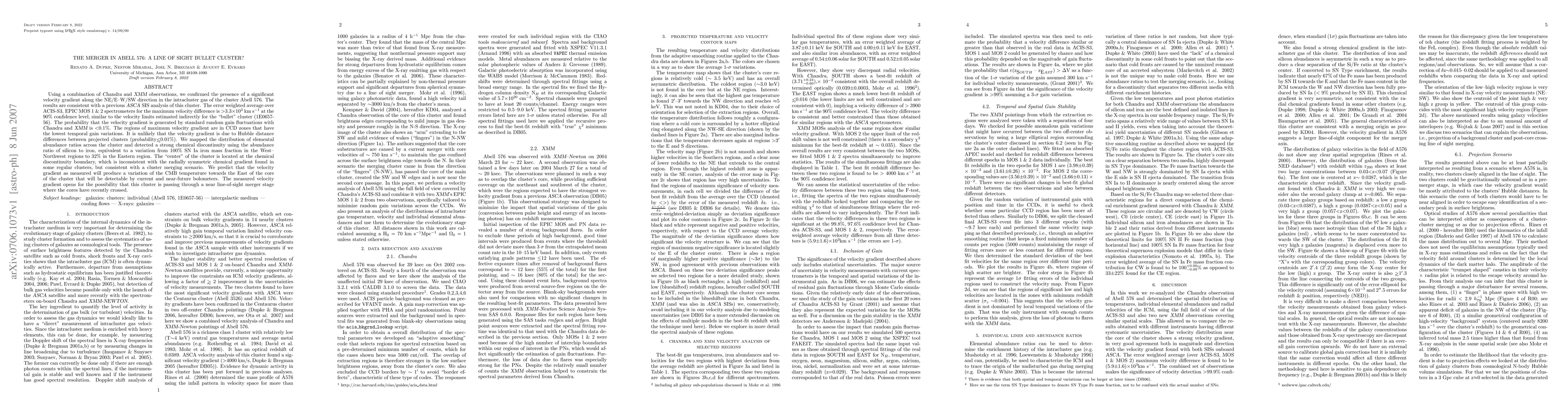 Using a combination of Chandra and XMM observations, we confirmed the presence of a significant velocity gradient along the NE/E-W/SW direction in the intracluster gas of the cluster Abell 576. The results are consistent with a previous ASCA SIS analysis of this cluster. The error weighted average over ACIS-S3, EPIC MOS 1 & 2 spectrometers for the maximum velocity difference is >3.3E03 km/s at the 90% confidence level, similar to the velocity limits estimated indirectly for the "bullet" cluster (1E0657-56). The probability that the velocity gradient is generated by standard random gain fluctuations with Chandra and XMM is <0.1%. The regions of maximum velocity gradient are in CCD zones that have the lowest temporal gain variations. It is unlikely that the velocity gradient is due to Hubble distance differences between projected clusters (probability<~0.01%). We mapped the distribution of elemental abundance ratios across the cluster and detected a strong chemical discontinuity using the abundance ratio of silicon to iron, equivalent to a variation from 100% SN Ia iron mass fraction in the West-Northwest regions to 32% in the Eastern region. The "center" of the cluster is located at the chemical discontinuity boundary, which is inconsistent with the radially symmetric chemical gradient found in some regular clusters, but consistent with a cluster merging scenario. We predict that the velocity gradient as measured will produce a variation of the CMB temperature towards the East of the core of the cluster that will be detectable by current and near-future bolometers. The measured velocity gradient opens for the possibility that this cluster is passing through a near line-of-sight merger stage where the cores have recently crossed.