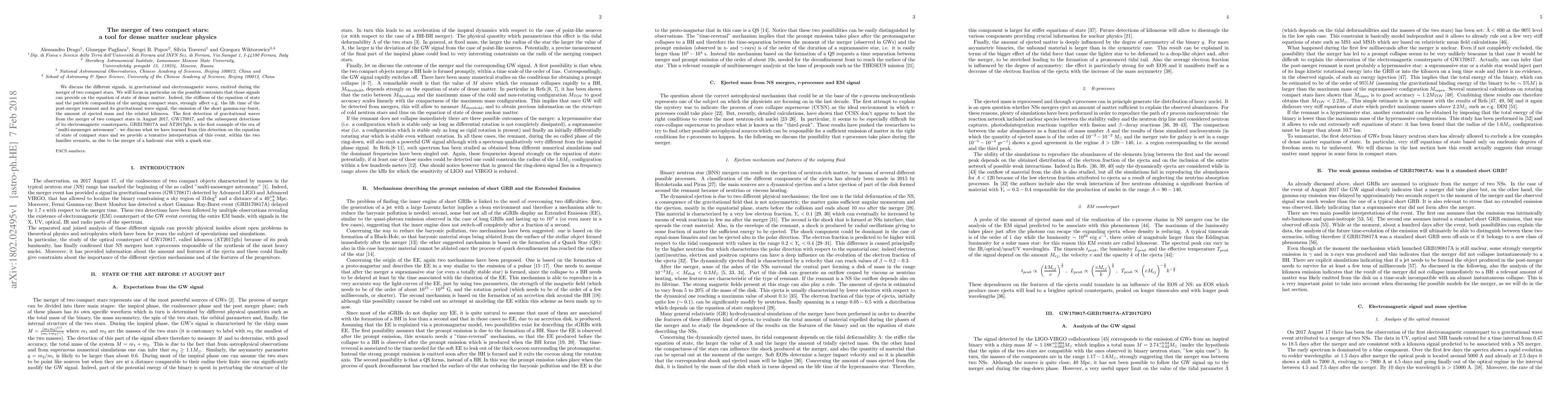 This paper explores the signals from the merger of two compact stars, emphasizing how gravitational and electromagnetic waves can constrain the equation of state of dense matter. The analysis of the 2017 event GW170817 and its counterparts suggests insights into the particle composition and remnant lifetime, proposing a merger between a hadronic star and a quark star.
