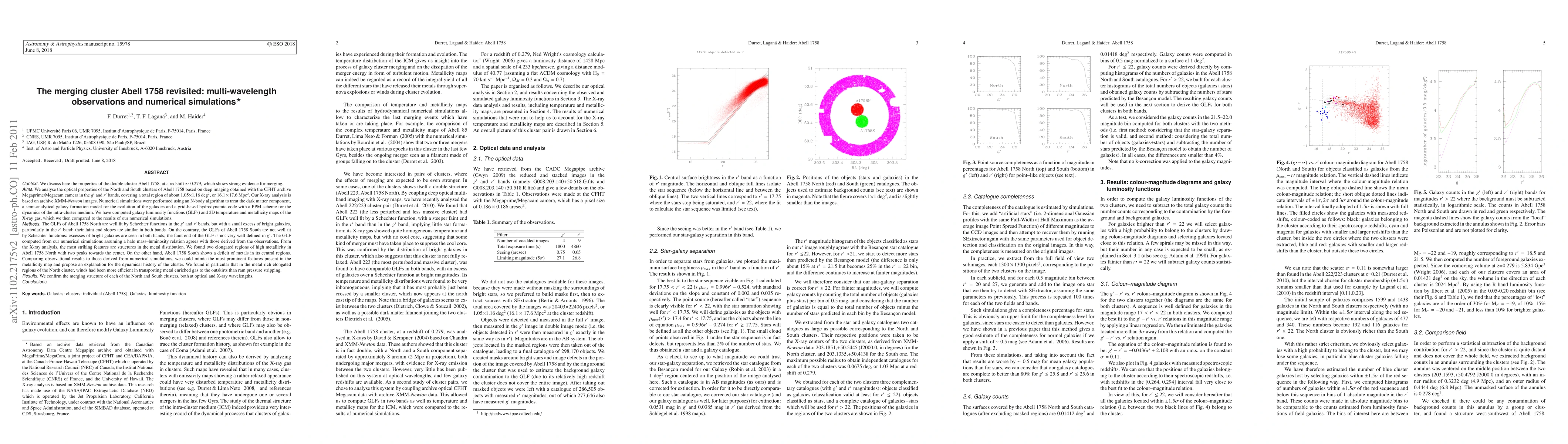 This paper revisits the merging cluster Abell 1758 using multi-wavelength observations and numerical simulations to analyze its optical and X-ray properties, confirming its merging nature and proposing a dynamical history explanation for its metallicity distribution.
