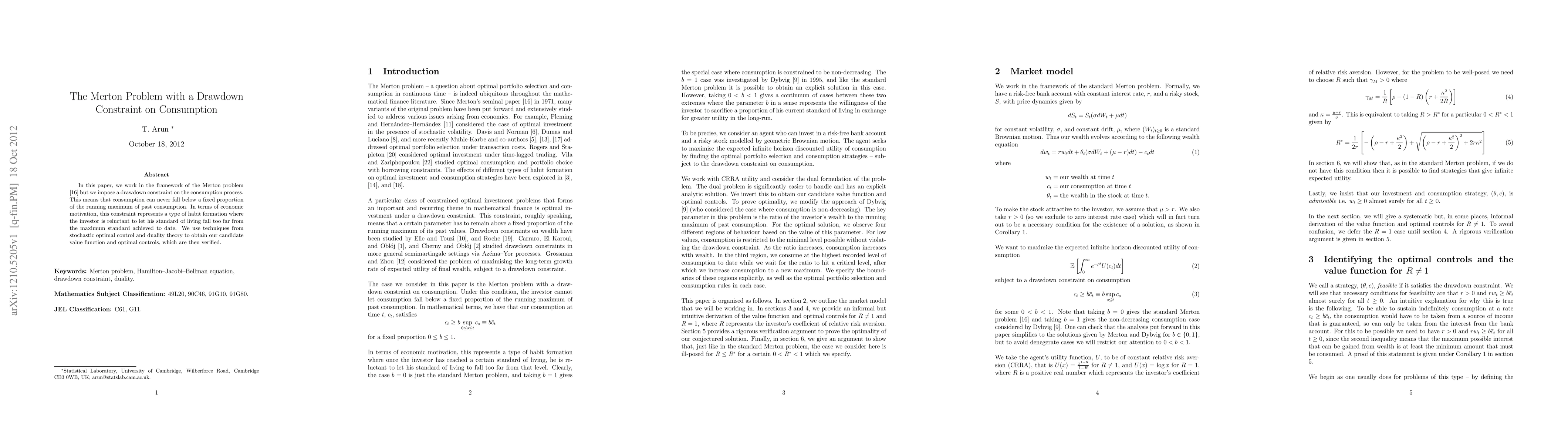 This paper addresses the Merton problem with a consumption drawdown constraint, modeling habit formation where consumption cannot drop below a proportion of past maximum consumption. It employs stochastic optimal control and duality theory to derive the optimal value function and controls.