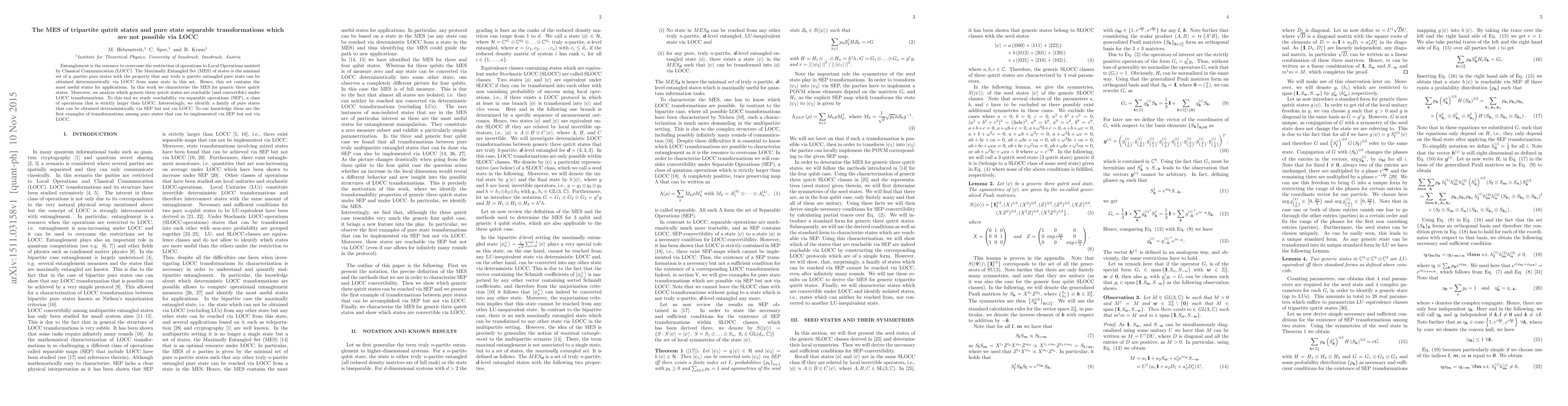 This paper characterizes the Maximally Entangled Set (MES) for tripartite qutrit states and identifies pure state transformations that can be achieved via separable operations but not via Local Operations assisted by Classical Communication (LOCC), providing the first examples of such transformations.